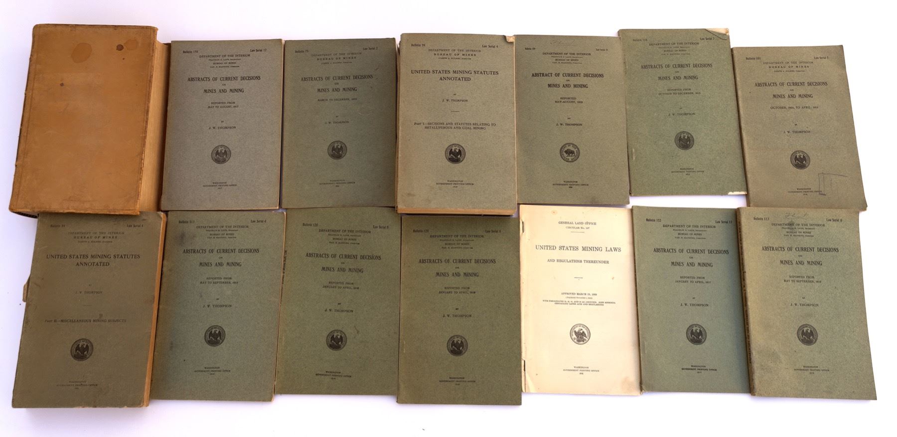 14 Bureau of Mines bulletins by J. W. Thompson c. 1912-20 with abstracts of current decisions on mines and mining. Hardcover Snyder on Mines 1902, a consolidation of metals, coal oil and gas mining laws. 709pp with TOC. State: City: Date: Provenance: Stuart Mackenzie Montana Ephemera Collection
