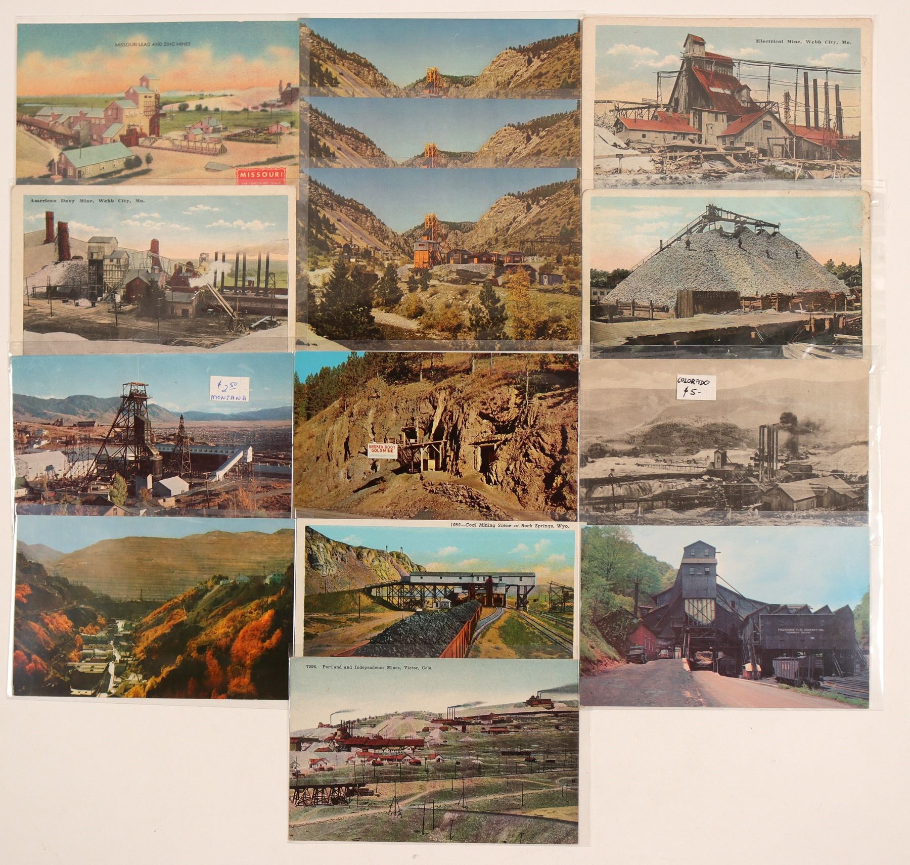 11 color postcards with one b/w and two duplicates of outside mining sites. Includes gold, lead and coal mines. Picture of Broken Boot Gold Mine, Bingham Canyon and Copper Mine and Kelley Mine.