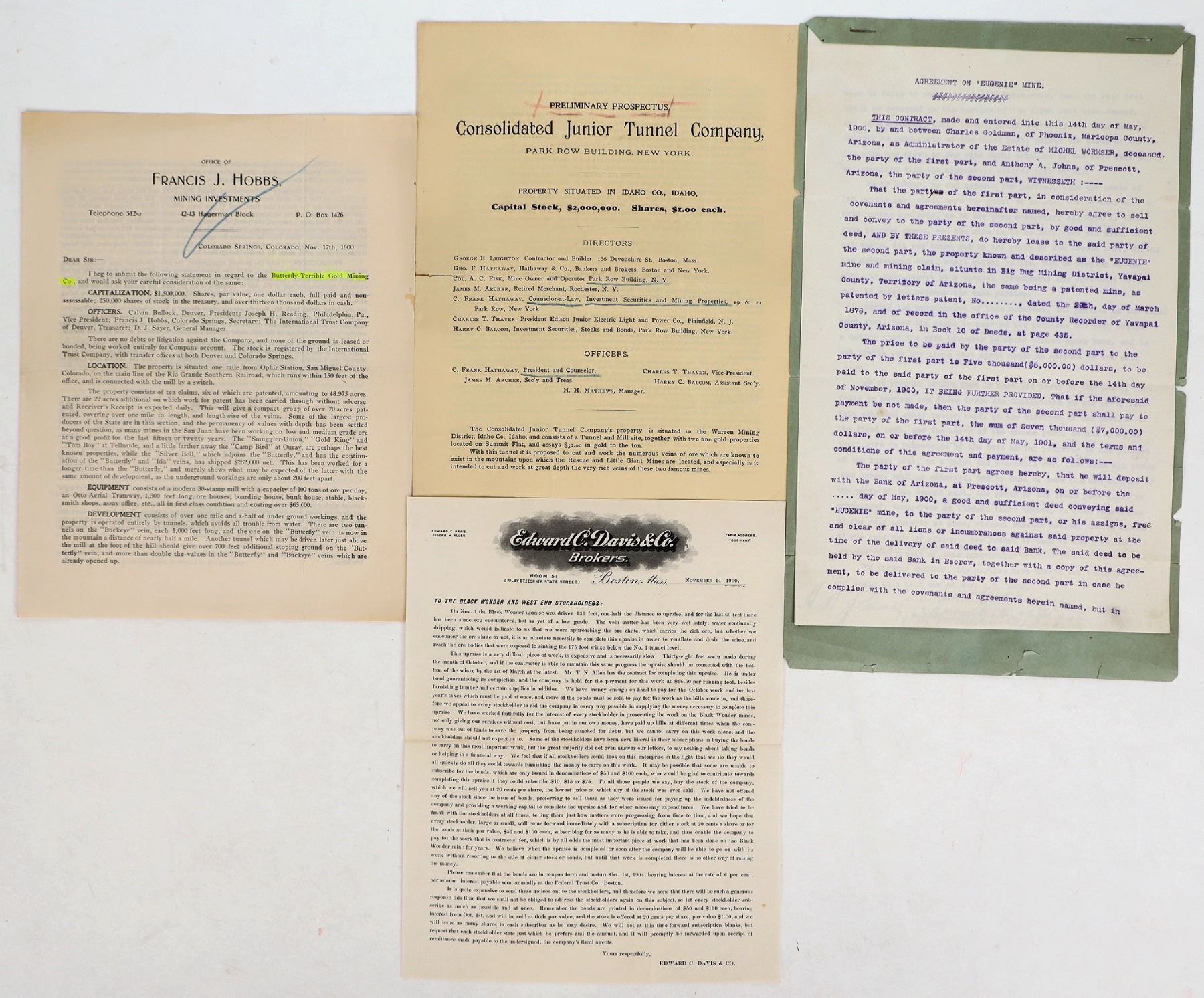 Cons. Jr Tunnel preliminary prospectus, Warren Mining District, ID, 1900. Butterfly-Terrible Gold MC prospectus with highlighting marks, 1900. United Mining Co 1908 investment letter. 1900 Eugenie Mine lease of mine and claim, located in Big Bug Mining district, Yavapai, AZ. Black Wonder and West End 1900 stockholder letter.