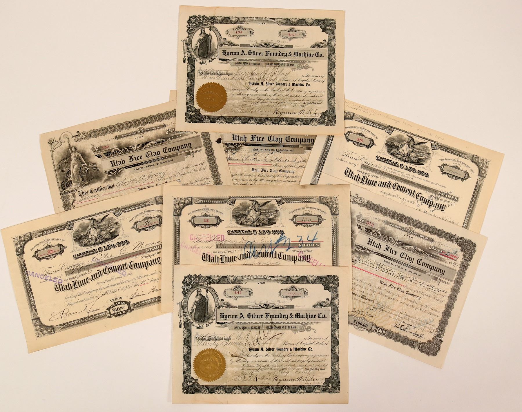Lot of 8 mining related stocks from the support industry. Utah Fire, Utah Lime, Utah Fire Clay, Hyrum. 1900s. Utah