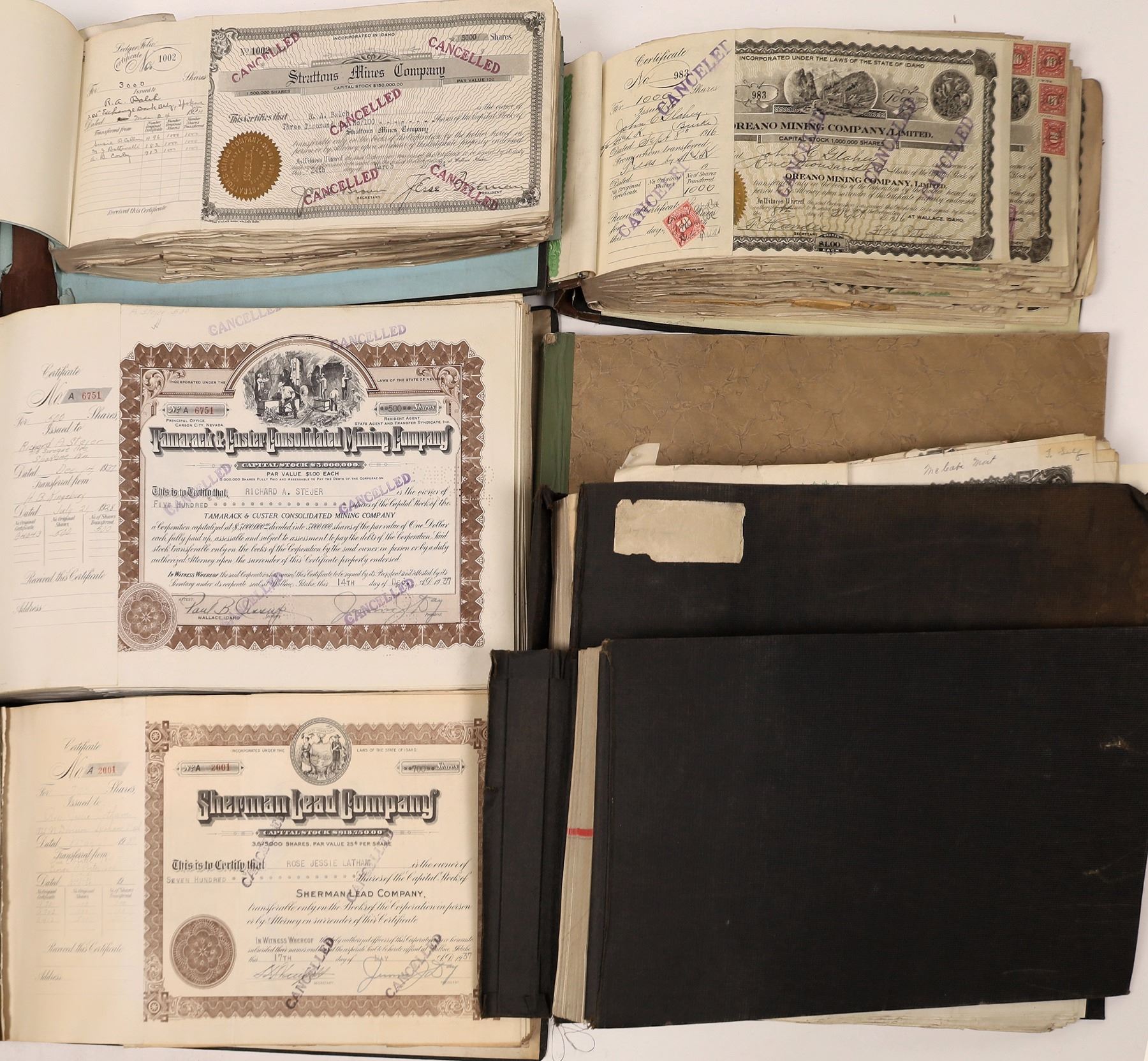 A collection of nine (9) stock certificate books, with many removed, all canceled. Mine certificates include Ambergris Consolidated Mining Company, Guelph Mining & Milling Company, Portland Mining Company, Sherman Lead Company, Tamarack & Custer Consolidated Mining Company, Oreano Mining Company LTD and Strattons Mines Company. There are several nice Revenue Stamps throughout. Please see photos for more detail and condition. State: City: Date:1800's-1900's Provenance: Stuart Mackenzie Montana Ephemera Collection