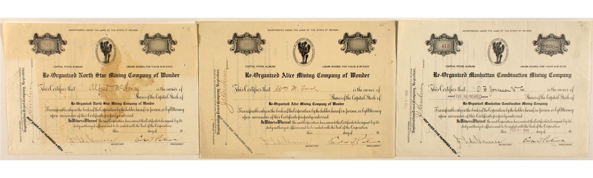 Lot of 3: unusual lot that contains 3 different companies, from 2 different districts, all with the same exact signatures of the president & secretary. This president was one Edward T. Paterson. The stocks, all with "Re-Organized" in there mastheads, are from the Manhattan and the Wonder districts. These are in very good shape, except for staining on one.City: County: Nye & Churchill CountiesState: NVDate: c1909