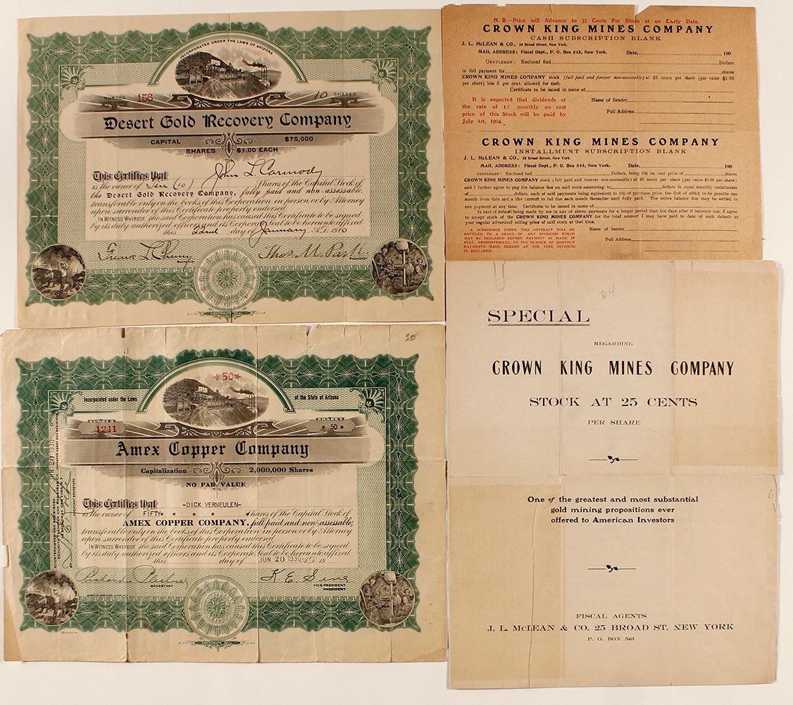 Lot of 4: 2 stock certificates, and a set of prospectus documents for the Crown King Mines Co. The stocks are: Desert Gold Recovery Co. dated 1910, making this an Arizona Territorial piece, and the Amex Copper Co. from 1930. Both are the same litho, from Goes, and feature the same vignettes. The Crown King Mines prospectus offers shares at 25 cents, and claims it as "One of the greatest and most substantial gold mining propositions ever offered..." Documents are overall in good condition, with age foxing, fold creases and some yellowing. City: State: Arizona Date: c.1904 hwac# 20312