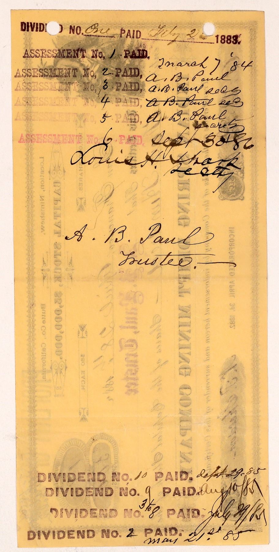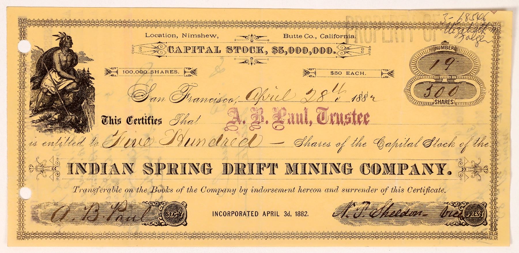 This is a California mining stock issued to an important figure in California and Nevada mining history. Location: Nimshew, Butte County, California (printed at top). No. 19, issued for 500 shares to A.B. Paul, trustee, on April 28th, 1882 in San Francisco. Signed by A.B. Paul as secretary and N.T. Sheldon as vice-president. Also signed by Paul on reverse. Punch cancelled. Black print on yellow paper, Native American vignette. Folds, stamp and pen writing at upper right. A(lmarin) B. Paul was an early important figure on the Comstock. Paul arrived in California in 1849 having travelled through Panama. He briefly operated a hardware business in Sacramento before heading to Nevada City in 1850 to pursue mining. There, he built one of the first quartz mills in Nevada County, and became associated with George Hearst. In the mid 1850s, he made his way back to San Francisco and was an important figure in its development. He also supported the Vigilance Committee, coming together with others to form the paper the True Californian. In 1857, he made his way back to Nevada County and built the Oriental Quartz Mill. But news of an exciting find in Nevada reached Paul, especially in a letter to him from George Hearst that said: "You will soon know of tons of gold and silver leaving here every month." In 1860, Paul joined the rush to the Comstock and headed to Nevada, where he erected the first mill (twenty-four stamp) on the Comstock to process ore. It was called the Pioneer Mill and was located at Gold Canon, just below Devil's Gate. There, he developed the Washoe pan process first made famous on the Comstock. It was so successful that in 1865, he sold his mining interests and formed a banking business in Gold Hill. He also was the organizer of the Imperial Cons. MC. In 1867, he sold his Gold Hill banking business to the Bank of California and headed to Inyo County to resume mining and milling. In 1868, he secured patents on new processes for amalgamating the precious metals. By 1882, Paul is living in San Francisco where this stock was issued. [Ref: History of the New California Its Resources and People, Volume II, Irvine; History of the Comstock Lode, Smith] The AB Paul papers are currently in the Bank of California archives. Gold Hill Nevada Franklin Collection