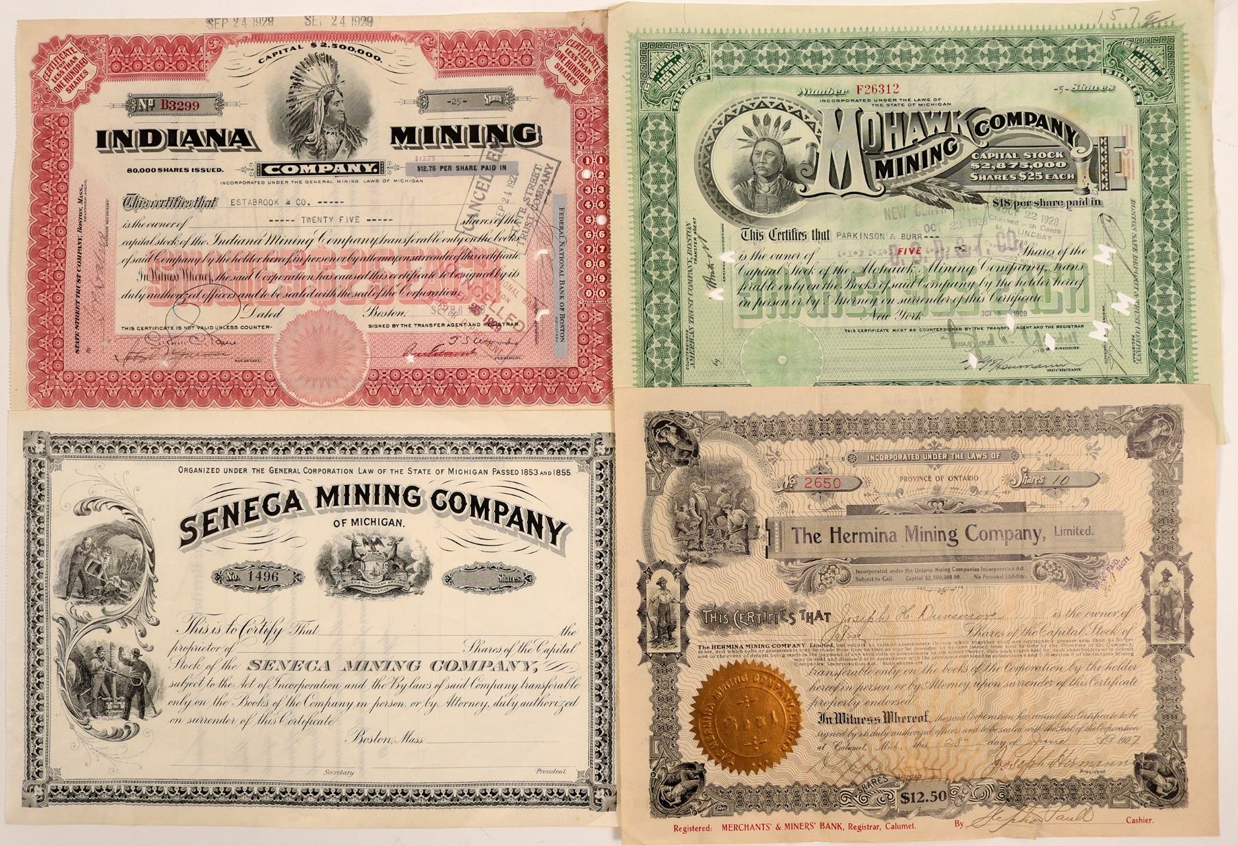 Item # 1 of 4: The Hermania Mining Company, Limited. Province of Ontario No#2650, for 10 Shares. Issued to Joseph H. Dunsmore. June 28th, 1907. Issued at Calument, Mich. very nice with 7 vignettes of miners. Registered by the Merchants & Miners bank,Registrar, Calument. Stephan Paul, Cashier. 8 1/8" high x 11" long, cancelled. Item #2 of 4: Seneca Mining Company, Michigan./ No # 1496. Un issued and unsigned by anyone. 2 nice mining vignettes, and a third with 2 Elks and an Eagle. 7 5/8" high x 11' long. Item #3 of 4: Mohawk Mining Company( Vignette of Chief). Number # F26312, for 5 Shares.Incorporated in Michigan. Issued in New York, Oct. 23 1928. Issued to Parkinson & Burr. Printed by John A. Lowell, Bank Note Co, Boston. 8 1/8" high x 11" long. Cancelled. Item # 4 of 4: Indiana Mining Company.Incorporated in Michigan. Number #B3299. 25 Shares Issued to Estabrook & Co. Issued in Boston, Sep 26 1928. Signed by J.S Woods, President 7 1/2" high x 11 1/4" long. Printed by Franklin Lee Division- American Bank Note Co. Boston. Has nice vignette of Indian chief on front , and 4 revenue stamps on the reverse. Cancelled. ( All items in fine to extra fine condition). Nice foursome of stocks. (RH).Houghton Estate Collection