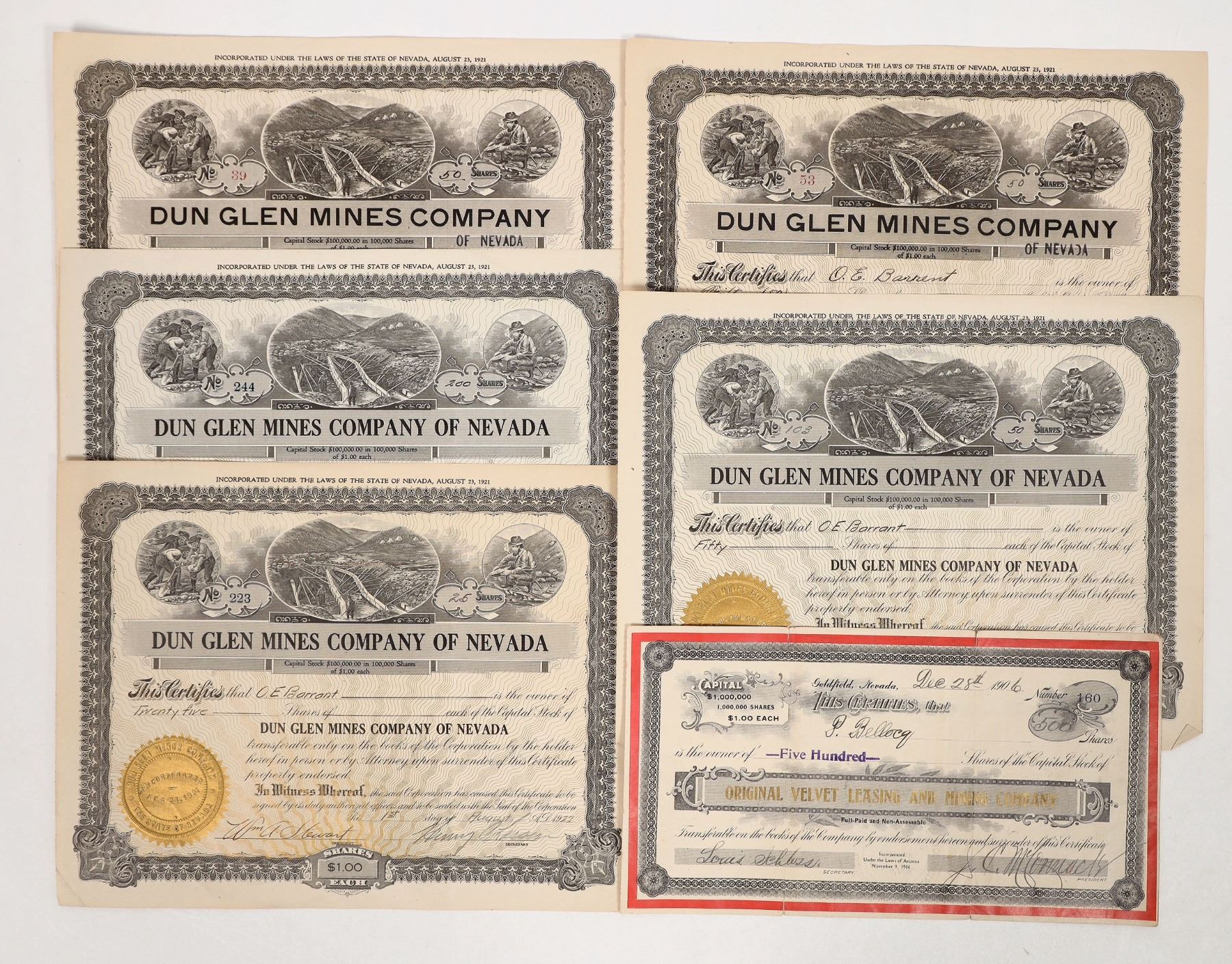 There is a stock from the Original Velvet Leasing and Mining Co. with a red border issued in Goldfield, Nevada in 1906. There are five Dun Glen Mines Co. stocks issued in 1921 and 1922 signed by William A. Stewart and Henry Lassen. Please see photos for details.