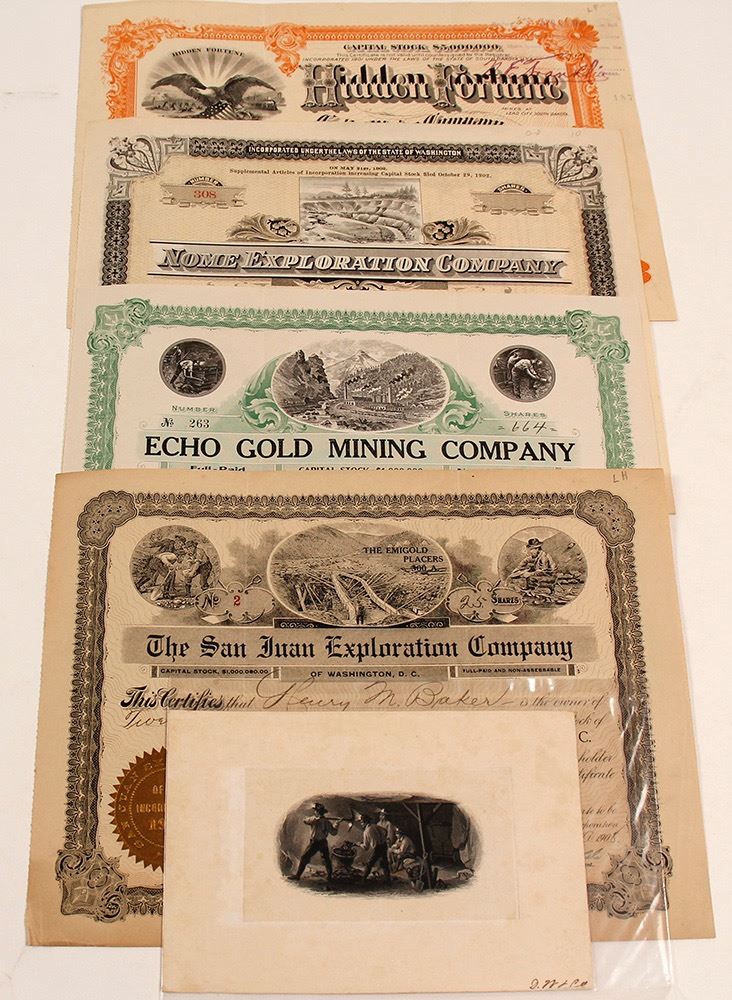 Rare c. 1860 American Bank Note Co. fine steel engraving proof sheet of mining vignette, 4.5" x 6.75". Stocks from San Juan Exploration issued 1908, Echo Gold Mining issued 1923, Nome Exploration u/i, Hidden Fortune Gold Mining issued 1902. Date: Location: HWAC# 56512