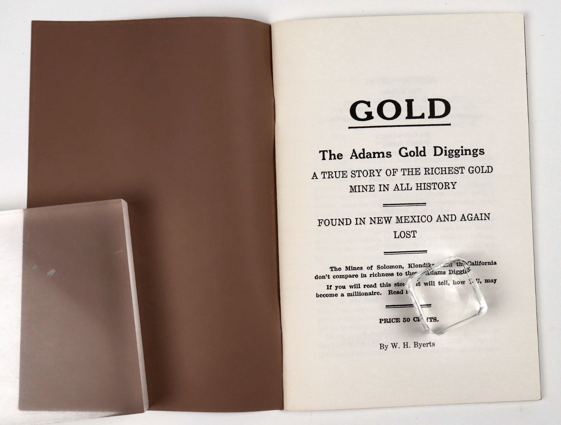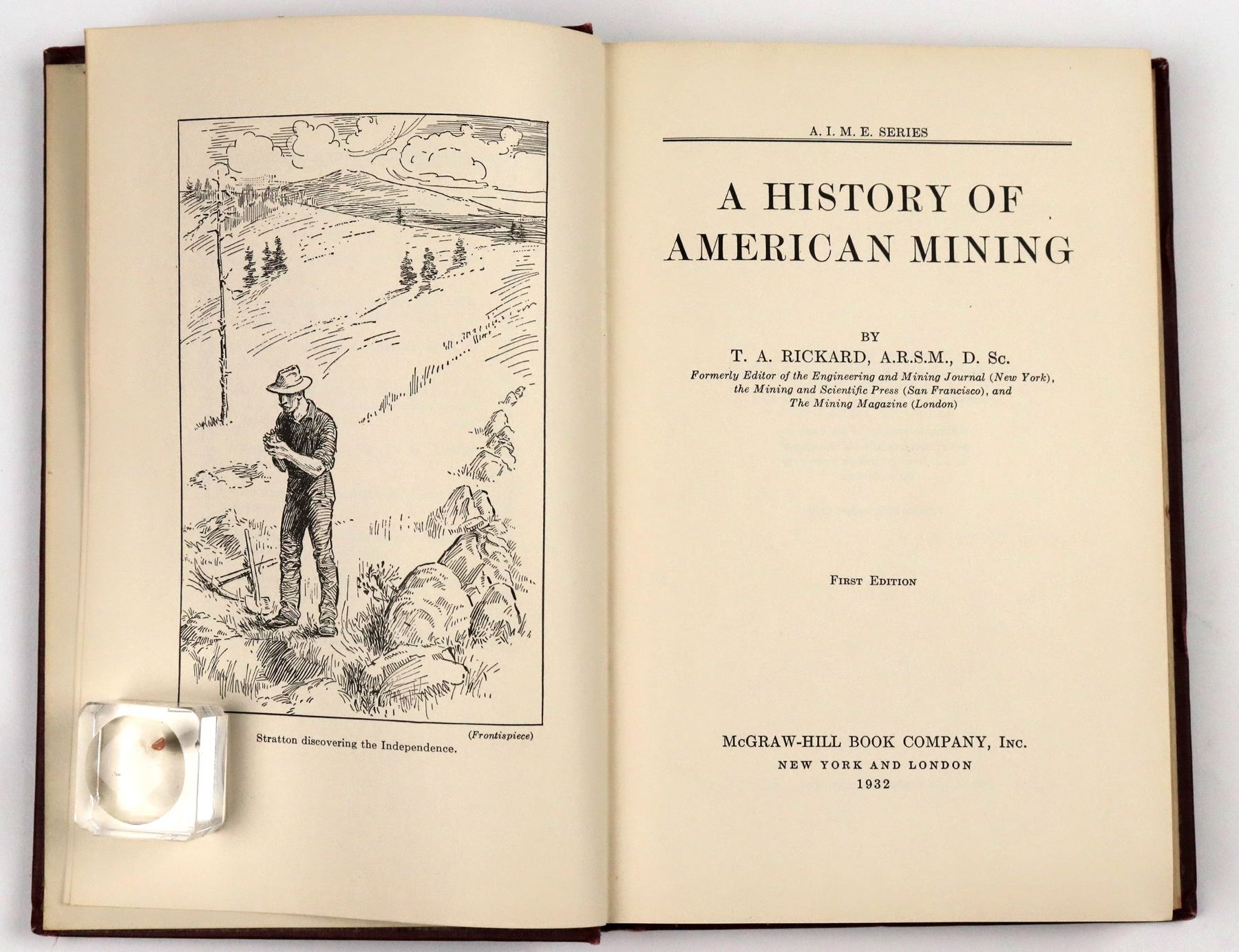 Four books and one booklet about mining, including: "Search for the Seven Cities, The Opening of the American Southwest." John Upton Terrell. 1970. First Edition. 151 pp. 8.5" x 5.5". Illustrations and five maps. Dust jacket. Fine; "Gold - The Adams Gold Diggings, A True Story of the Richest Gold Mine in All History, Found in New Mexico and Again Lost." From the cover: "The Mines of Solomon, Klondike and the California don't compare in richness to these Adams Diggins'. If you will read this story, it will tell, how YOU, may become a millionaire." W. H. Byerts. Paperback booklet, 1988 First Reprint, Limited to 1,000 Copies. 1919 First Edition. 46 pp. 7.5" x 5". Fine; A.I.M.E. (The American Institute of Mining, Metallurgical, and Petroleum Engineers, Incorporated) Series. "A History of American Mining." T.A. Rickard, A.R.S.M., D. Sc. 1932. First Edition. Maps and illustrations. Bookplate: "From Seeley Wintersmith Mudd to William Oliver Barnard, Jr., Junior Member A.I.M.E." Seeley Wintersmith Mudd (1861-1926) was an American mining engineer. 419 pp. 8" x 5.5". Very good; "The Lost Mine of the Mono, A Tale of the Sierra Nevada." C. H. B. Klette. 1909. First Edition. 215 pp. 7.5" x 5". Staining on cover, front hinge detaching, browning on title page, slight stains first several pages; "The Power of Gold, The History of an Obsession." Peter L. Bernstein. 2000. First Edition. A book about man's infatuation with gold throughout history and the lengths he will go to obtain it. 432 pp. 9" x 6". Dust cover. Fine.