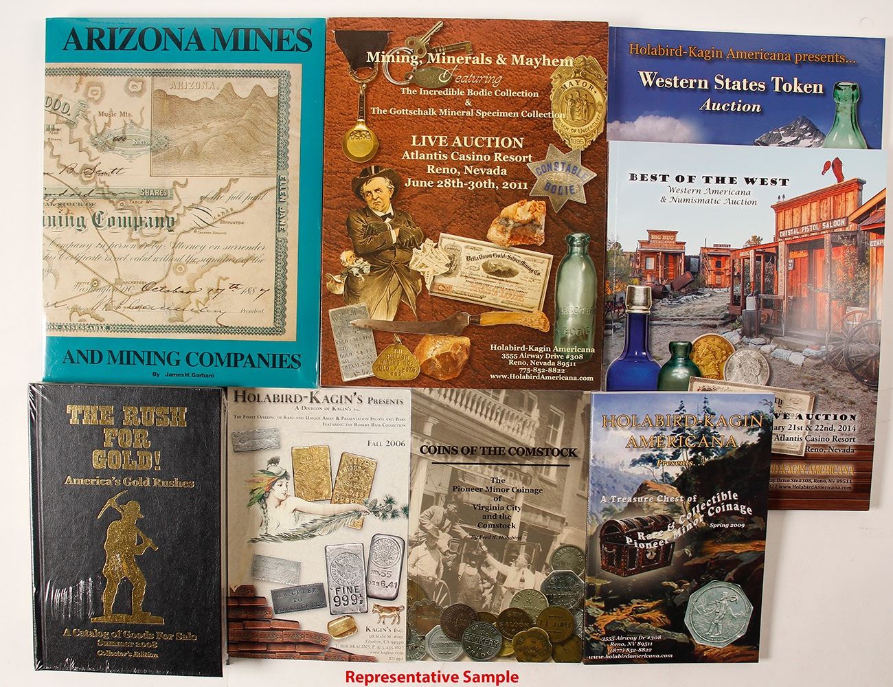 Approx 47 auction catalogs and books with duplicates. Topics include Western tokens, mining, minerals, coins of the Comstock, Gold Rush etc. Date: Location: HWAC# 571920