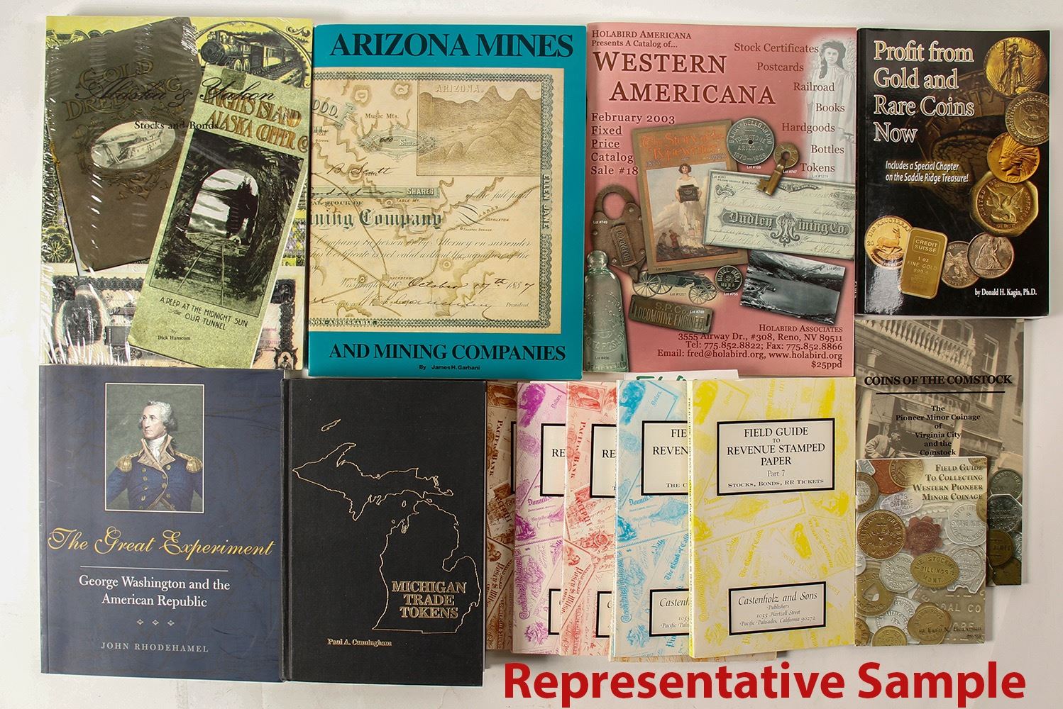 4 Field Guide to Collecting Western Pioneer Minor Coinage, 10 Coins of the Comstock, 1 Michigan Trade Tokens. 4 Arizona Mining, 6 Field Guides to Revenue Stamps, 1 Profit from Gold and Rare Coins, 1 Alaska and Yukon Stocks and Bonds, 6 Holabird Americana Catalogs, 1 The Great Experiment Date: Location: HWAC# 57258