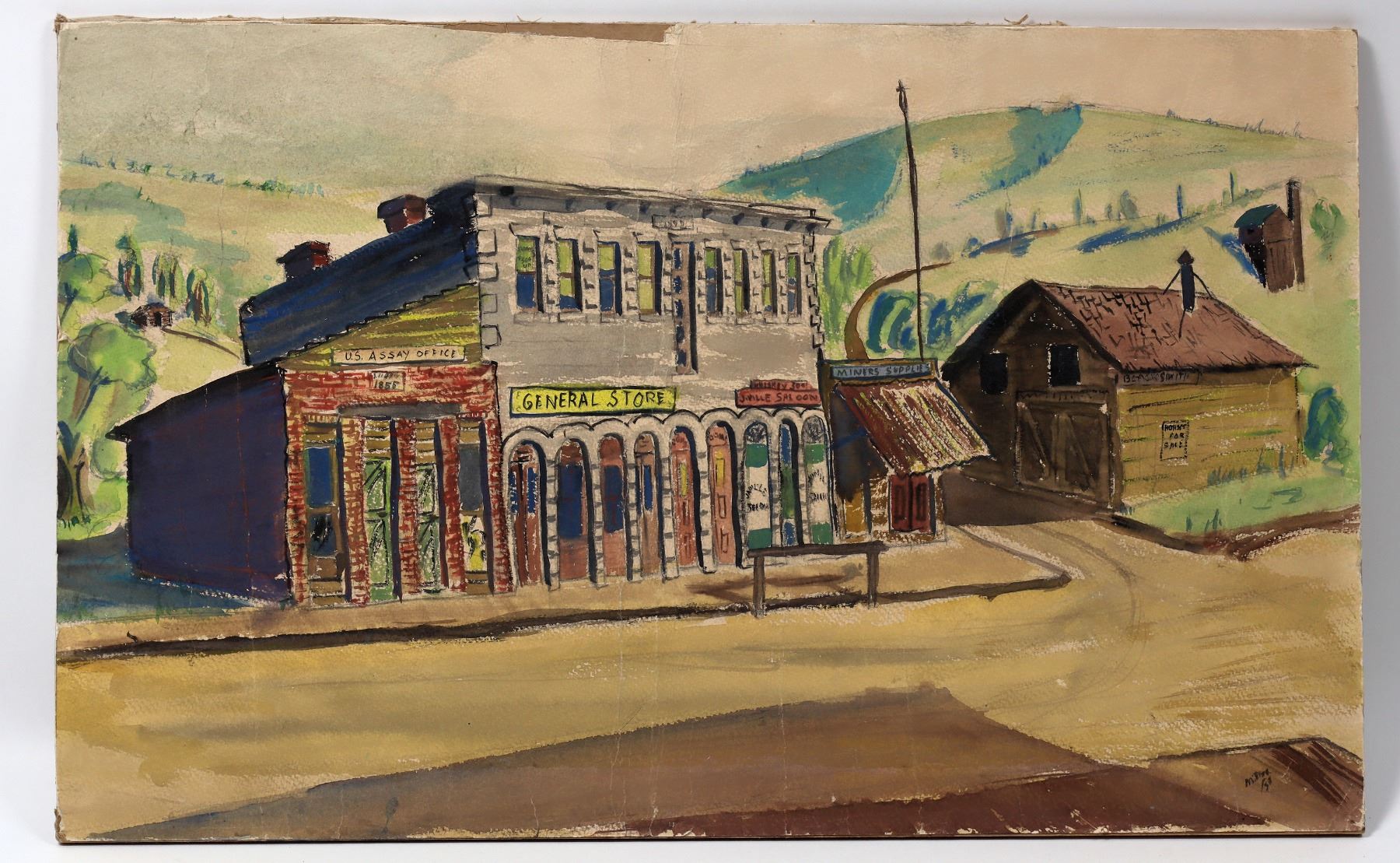 1950 Water color by Miller, 1950. J'ville saloon, US Assay Office 1855, General Store. Miner's supplies and stable. Location unknown. 14x22.5". Top and bottom edge wear.