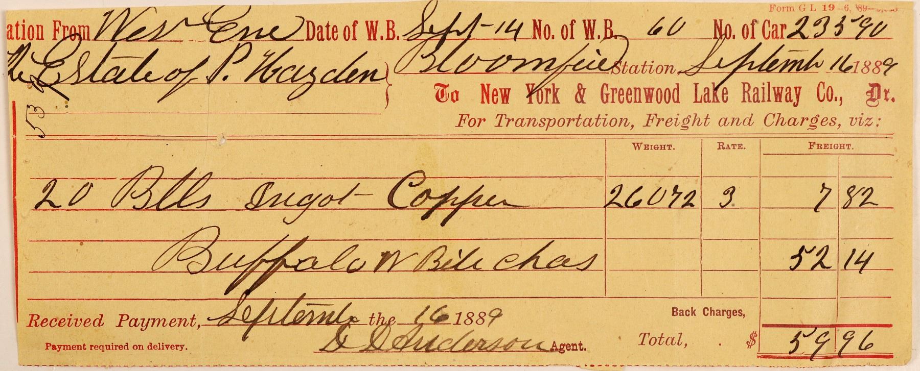 Holy Smoke !! A transfer receipt for 26, 072 copper ingots !! From the estate of P Hazden, Coming out of the Bloomfield station. Headed to New York & Greenwood Railway Co. Also Buffalo N Bile chas. Signed by D. D. Huderson, Agent. Cost $ 59.96 ( Good rate , huh? ) 3 1/4" tall x 8" long. Perfect condition. ( RH).Houghton Estate Collection