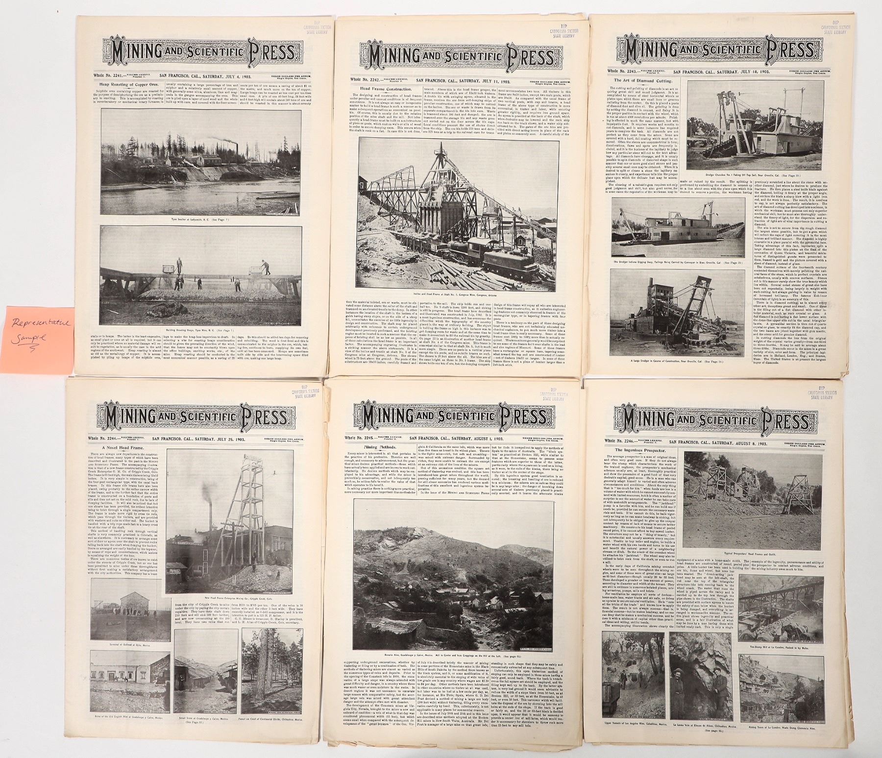 20 copies of 1902-03 Mining and Scientific Press. Great ads and illustrations of mining equipment and more which are suitable for cutting out and using as part of your projects. A fascinating resource of information from over 120 years ago! 15.75x11.5".