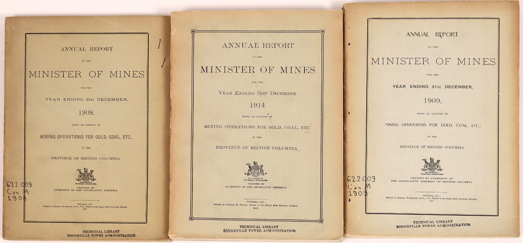 This lot contains three annual reports of mining activities for British Columbia, 1908, 1909,and 1914. Gold and coal mainly reported. These copies are soft cover bound, excellent condition. Fold-out photos, maps, and mine drawings. Spectacular B&W photos of the period. 7 in. X10 in.