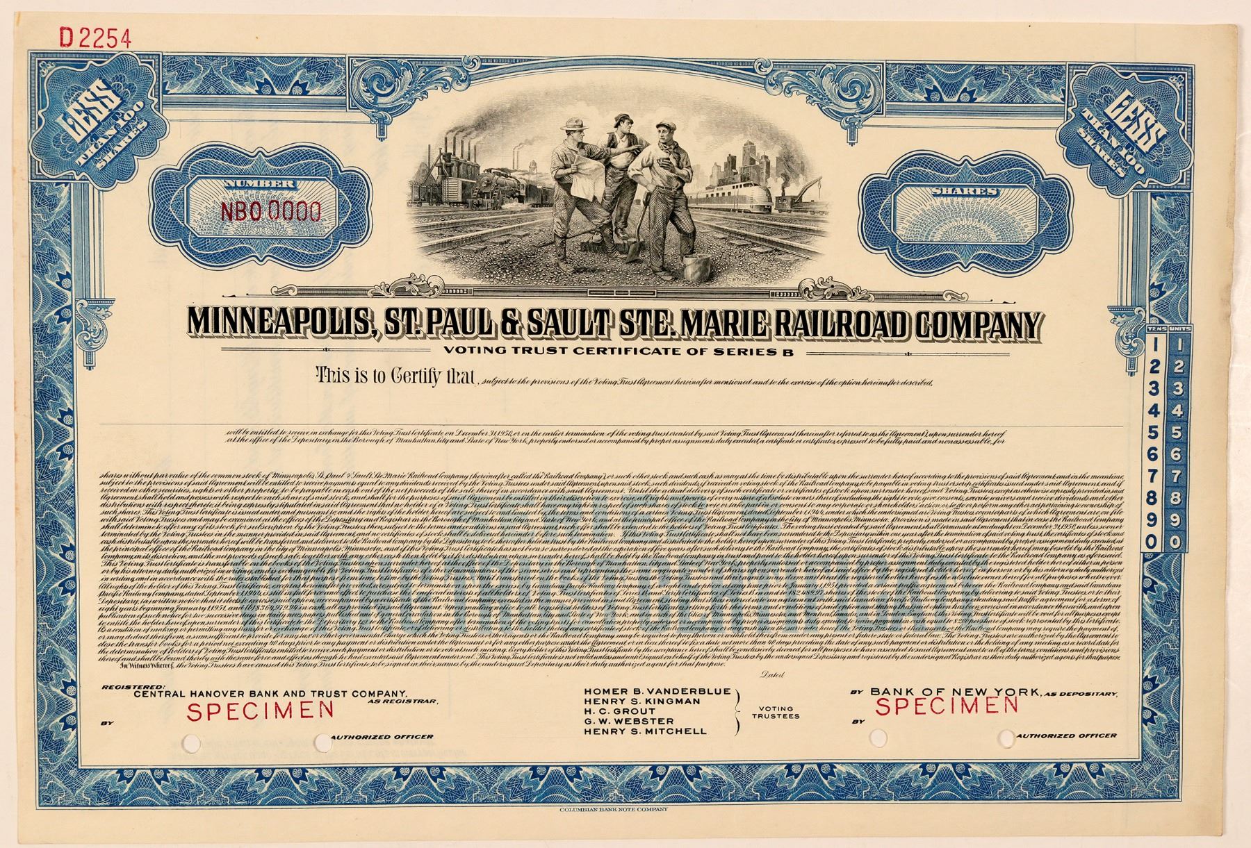 Voting Stock Trust Certificate Series B, Specimen (stamped) #NB00000, less than 10o shares no par value, not dated, BLUE< vignettes three men between rails steam loco left and diesel right. "SERIE B VOTING TRUST CERTIFICATE" blue underprint, Columbian Bank Note Co. printer. AU Ken Prag Collection