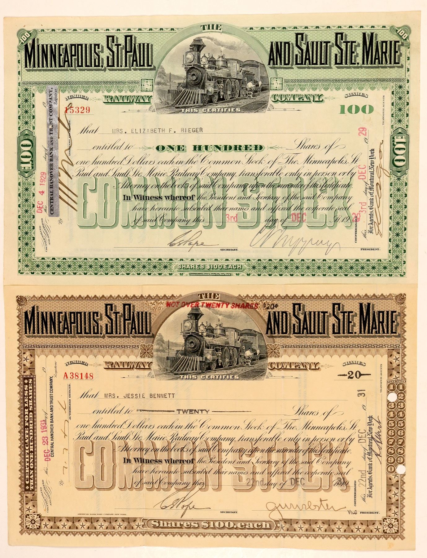 Two common stock certificates. I/U, $100 par, vignette of 4-4-0 loco r-l man alongside, "COMMON STOCK" underprint in respective colors. #15329 100 shares issued Dec 3, 1929. #A38148 20 shares issued Dec 22, 1931. American Bank Note Co printer. Both EF. Ken Prag Collection