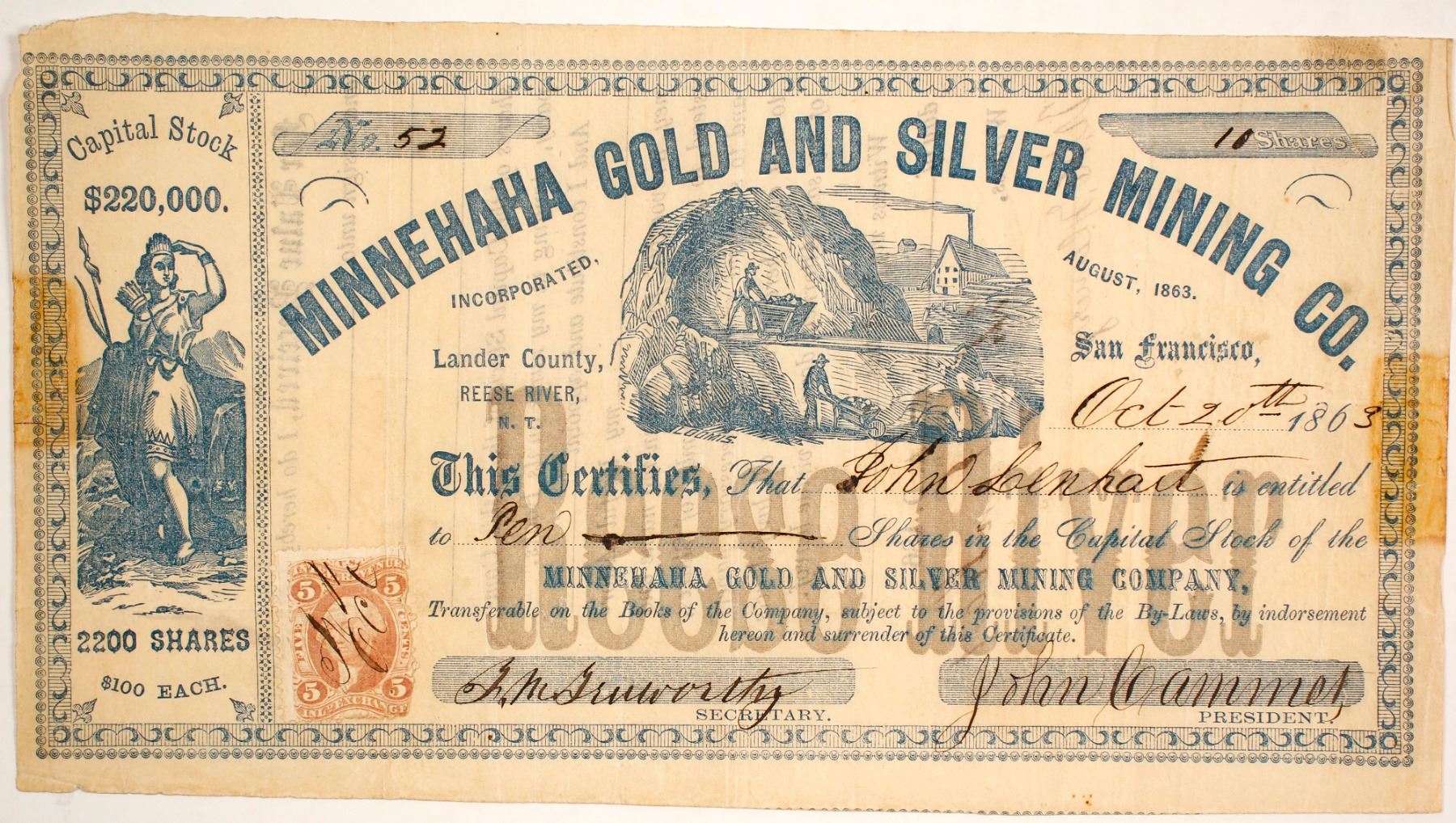 # 52 for 10 shares to John Lenhart. Datelined San Francisco 1863. Signed by secretary FM Truworthy and president John Cammet. Incorporated August 1863. Located at Lander County, Reese River, N. T. Great vignette of two miners coming out of two tunnels pushing barrows and ore carts. Small 5c Exchange Revenue stamp (20c may have fallen off). Not cancelled. Staining on center right and left edges where it seems to have been taped. One torn corner, small nick bottom left. Nice. Original trustees were Cammet, Truworthy, MJ Burke, William Murphy, and S Donnelly. Incorporated on August 18, 1863. The September 18, 1863 Marysville Daily Appeal reported that suddenly the Minnehaha Ledge has suddenly been resurrected. Rock that used to fo for $2 to $20 per foot now yields at the rate of $585 silver and $41.75 in gold. Hundreds of other ledges are sure to be resurrected in the same way not that everyone is found to be rich! This stock was sold one month after that article that probably was reprinted in newspapers around California. Is that why this stock was purchased??? Ken Prag Collection