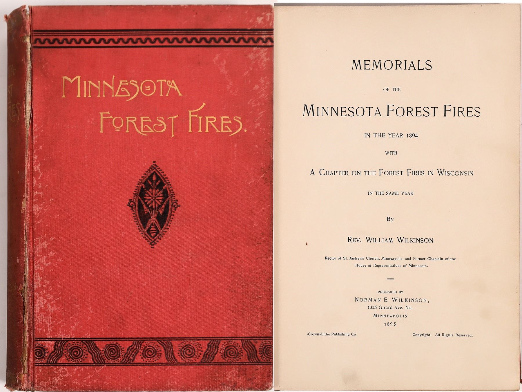 Hardcover Memorials of the Minnesota Forest Fires in the Year 1894 with a Chapter on the Forest Fires in Wisconsin. Attractive binding with gold highlights. 1895, 469pp with illustrations including finding victims. Spine starting to detach. State:Minnesota City: Date:1895 Provenance: Stuart Mackenzie Montana Ephemera Collection