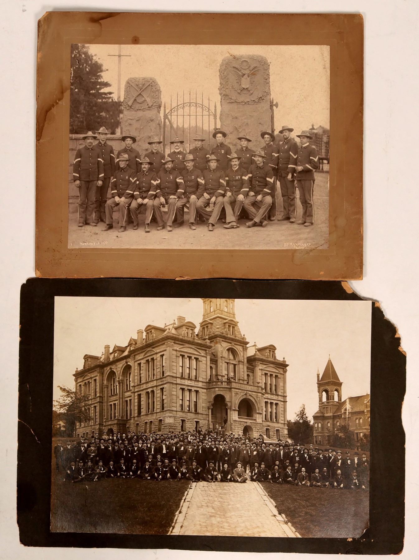 Two large black and white photographs mounted on stiff cardboard showing two large groups of men from Minnesota. The first is a 16 x 12-inch print mounted on a 20 x 14-inch black matte board, showing the 39th Annual Convention of Minnesota State Firemen on June 21, 1911, in front of the Blue Earth County Courthouse in Mankato in south-central Minnesota. The top-right corner of the matte board is missing as is the lower-left corner of the image. Completed in 1886, the Courthouse continues to house various Blue Earth County departments to this day. The walls were built of stone from a local quarry and finished with both rough "rusticated" and smooth "ashlar" surface treatments. The building behind and to the right of the courthouse no longer stands. The second image is 13-1/4 x 10-1/2 inches on a 17 x 13-1/2-inch board and shows a May 16, 1898, gathering of the 13th Minnesota Volunteer Infantry presumably prior to their departure to Manila during the Spanish-American War. The location of the photo is unknown. The typed text on the back of the photo tells the story of their departure from San Francisco on June 26 through their departure from the Philippines on October 5. These images are slices of Minnesota history worthy of adding to your collection. State: Minnesota City: Date: 1898, 1911