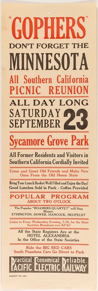 Gophers Don't Forget the Minnesota Picnic Reunion, Saturday September 23 year unknown. Pacific Electric Railway. 6" x 18". Date: Location: Los Angeles, California HWAC # 54373