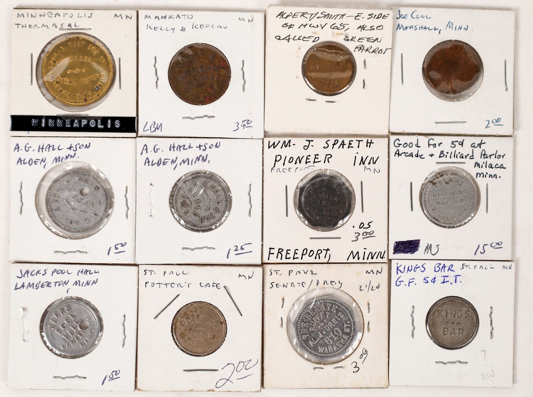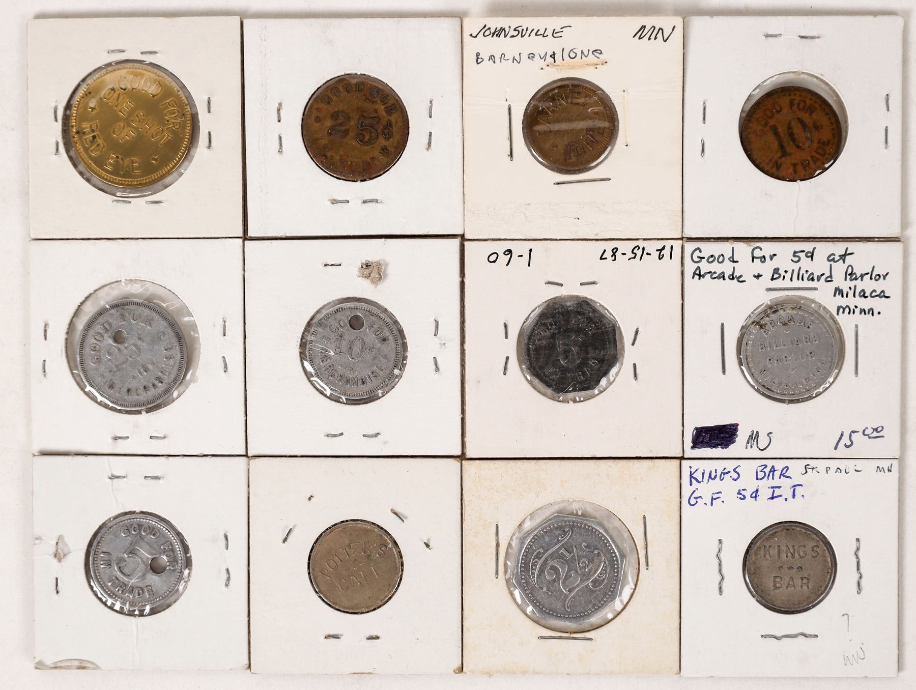 Lot of twelve tokens from Minnesota. Alden, Freeport, Lamberton, Marshall, Minneapolis, Mankato, Johnsville, Milaca, St. Paul (3). Minnesota