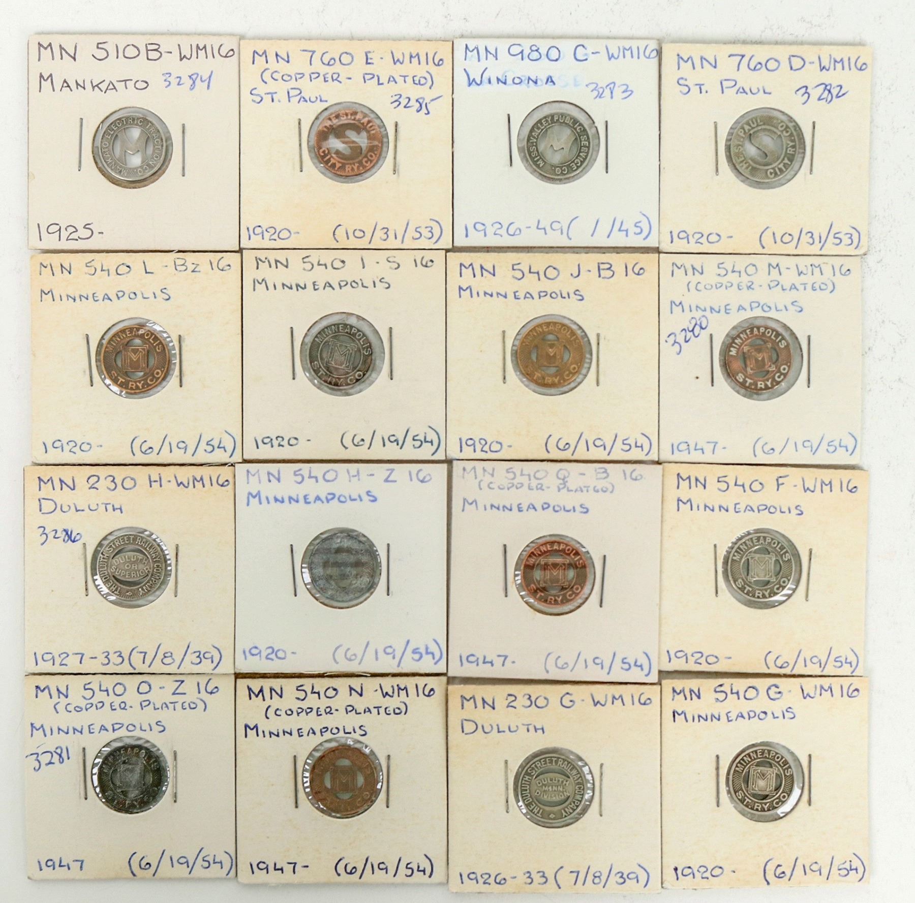 Group of 16 transportation tokens from various Minnesota companies. See photo for details.