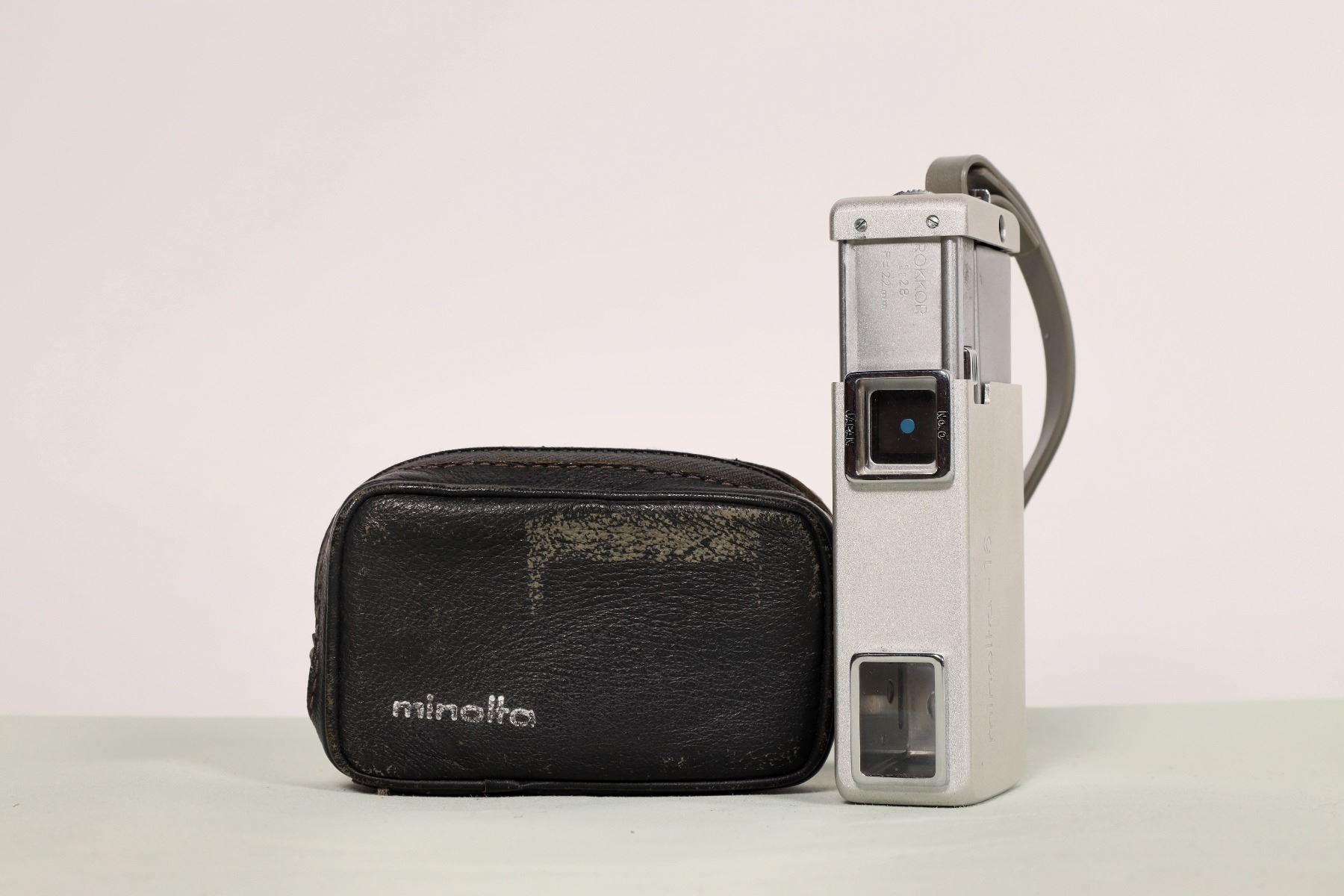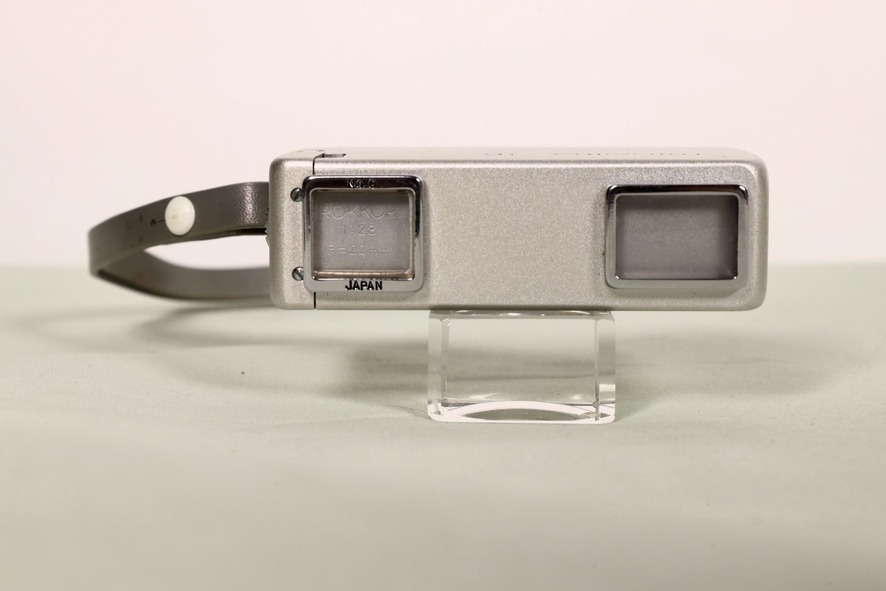 This model features a Rokkar f/2.8, 22 millimeter lens which stops down to f/16. It has the following shutter speeds: 1/30, 1/50, 1/125, 1/250 and 1/500. In a zippered carrying case.