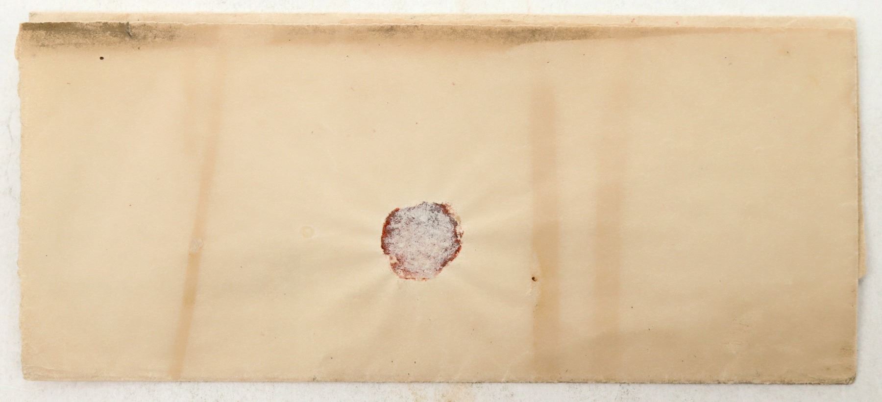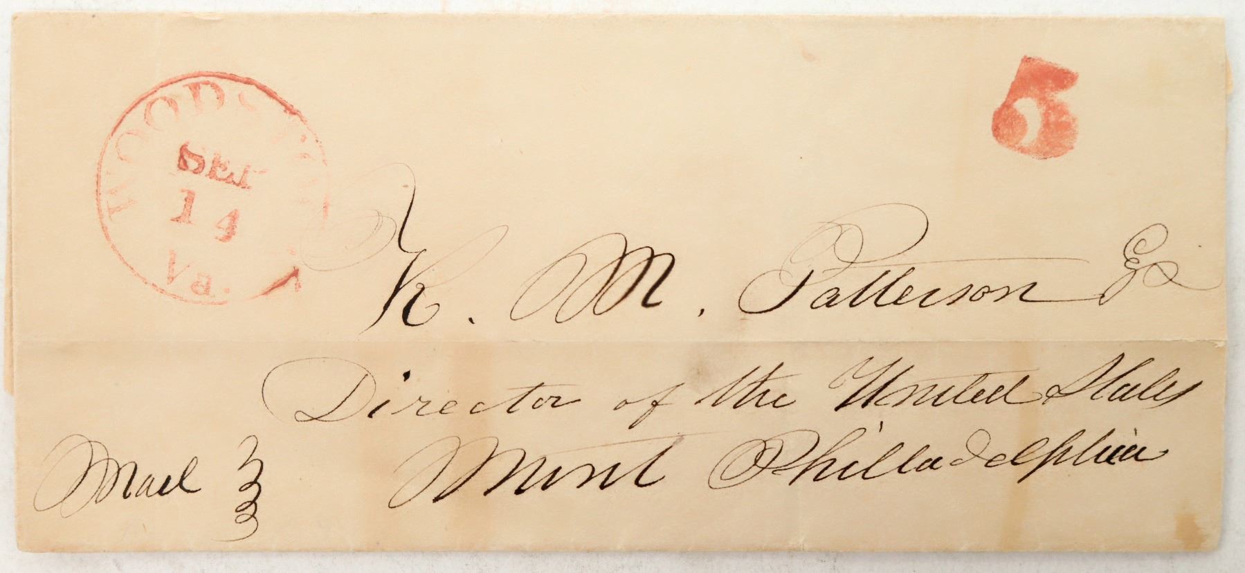 Folded cover sheet lacking the original contents of a letter written to Mint Director Robert M. Patterson, with a red Woodstock, Virginia circle cancel sent at a five cent rate.