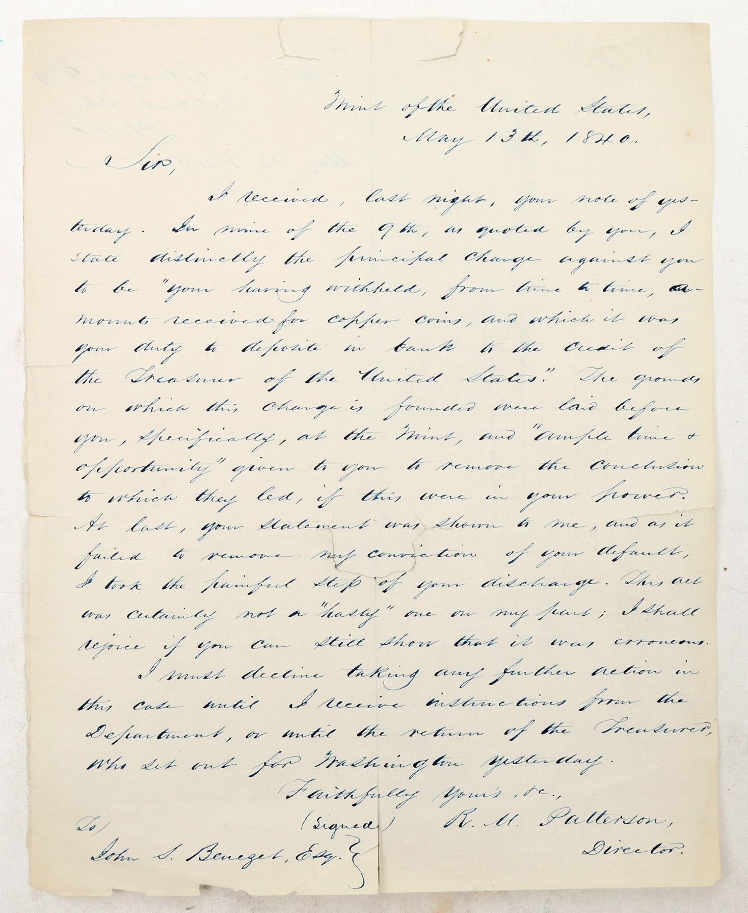 Fascinating letter (May 13, 1840) from Mint Director Patterson dismissing a key employee John S. Benezet. Benezet had regularly received copper coins for deposit. Benezet had apparently answered Patterson's complaint, but not in a satisfactory manner, such that the reporting of the copper coins to the credit of the USA was never made. "I took the painful step of your discharge. This act was certainly not a hasty one on my part. I should rejoice if you can still show that it was erroneous. "In short, it is clear that Benezet was taking in (receiving) copper coins in deposit, but never deposited the money to the credit of the Mint. A few cents at a time adds up quickly, and this letter does not address the apparent total amount Patterson believes is "missing." Patterson gives Benezet the benefit of the doubt, but Benezet cannot answer or act sufficiently. In further research, in February, 1841, Benezet was given ten days to answer and correct the situation, or summary judgement would be made in favor of the US. Nothing was found after that date in Newspapers.com.