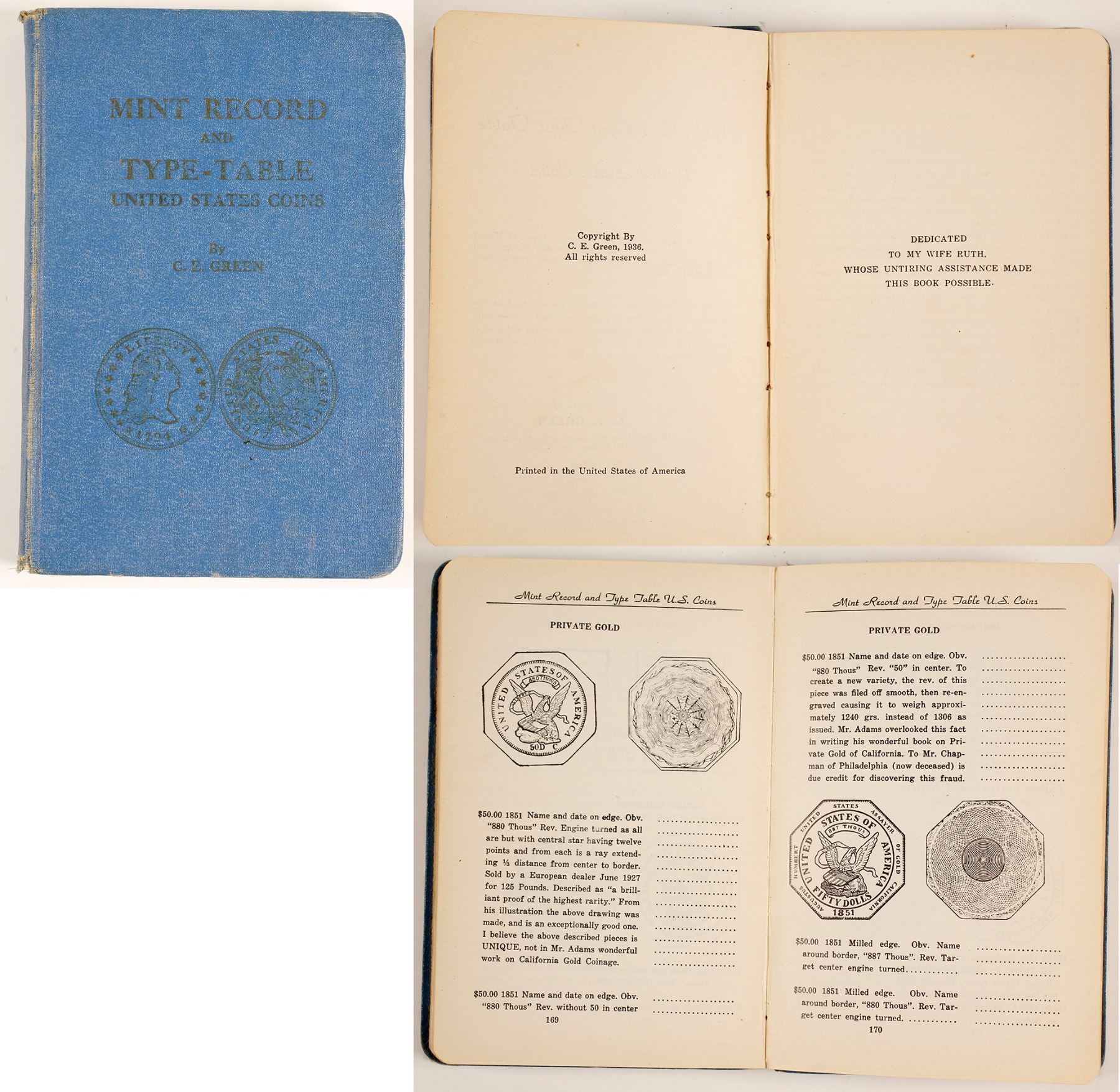 "Mine Record and Type Table -- United States Coins" by C.E. Green. Listing the major varieties of all regular issues of United States Coins as well as Private Gold, Encased Postage, and Fractional Currency. With illustration of most types of each series except the latter. Hardcover 1936 252pp. Cover has some wear.