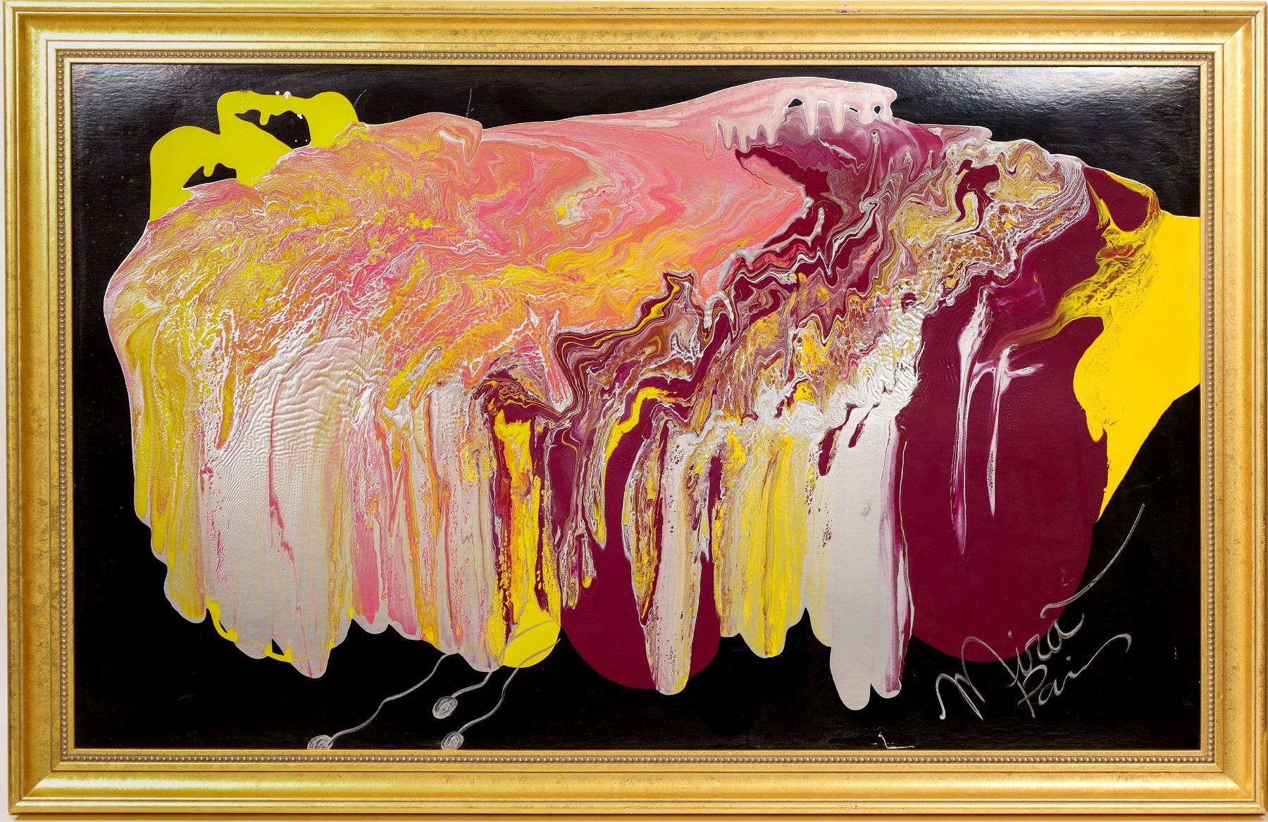 We have two "Mira Paris" signed pieces in this sale of the same size with identical frames that measure approximately 30" x 48" or 32" x 50" with gold colored frame. The backs of both were sealed with paper, but we carefully opened the back of one piece and verified that the reverse is also signed "Mira Paris". The paintings are acrylic done on Crescent cardboard.