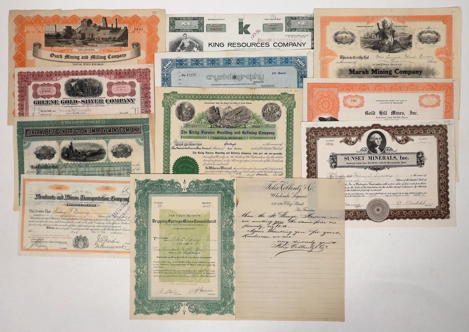 Miscellaneous grab bag of 11 stock certificates, and a letterhead, c1884-1976. Letterhead: Felix Coblentz & Co. Wholesale Liquors, San Francisco, undated. Stocks are related to mining, including: Merchant and Miners Transportation Co., Baltimore, Maryland, 1918; and Mineral Belt Construction and Improvement Co., 1884. Some with nice vignettes of miners, Native Americans, a mill, etc.