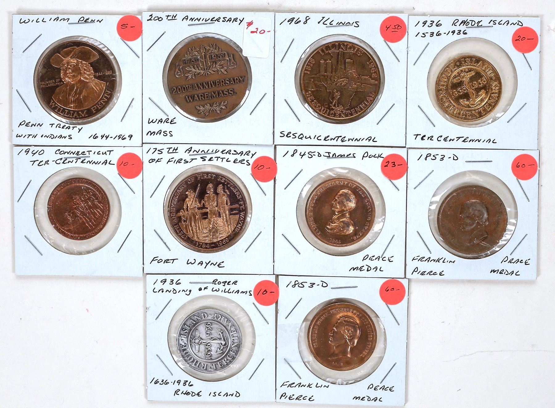 Lot of 10: Various Medals from Early America. Includes: Massachusetts 200th Anniversary.,(2) Peace Medal Franklin Pierce, TerCentennial Rhode Island.