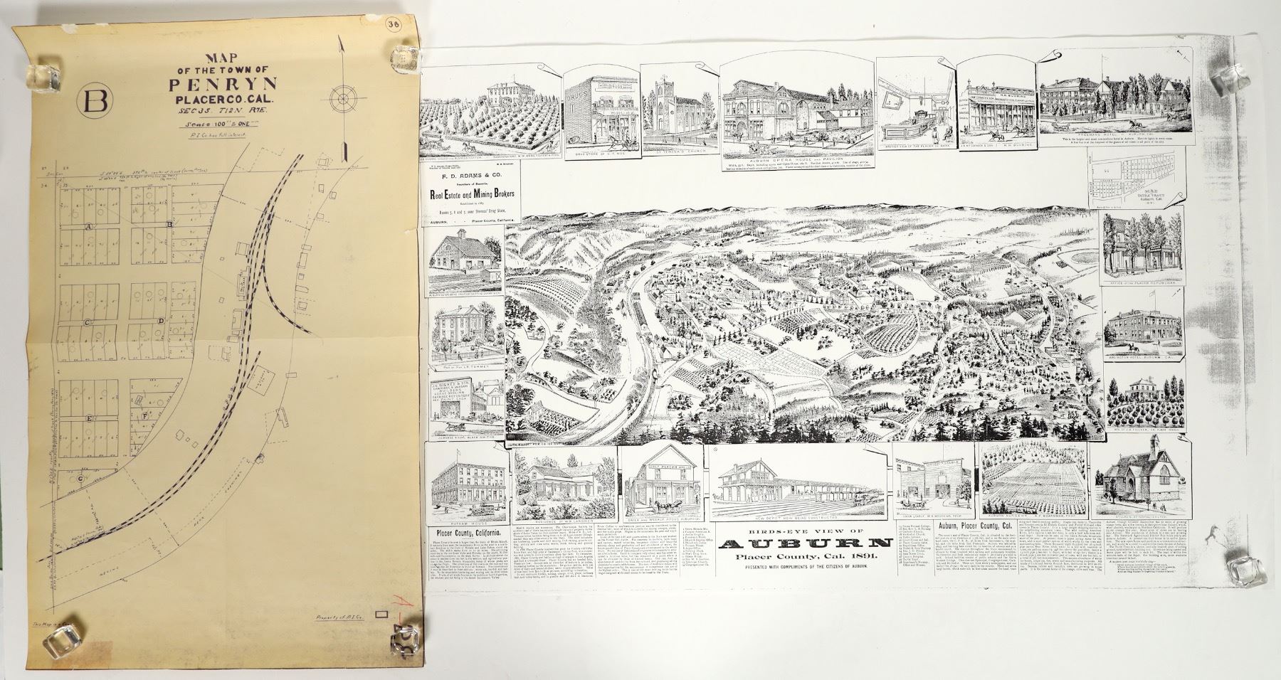Lot of 5. Repros., but still great sources of information. 1) Alta Town Site, 1875. 11 x 17" 2) Penryn, Pacific Improvement Co., January 4th, 1891, 16 x 26" 3) Colfax, Sanborn Map Co., June 1898, 3 sheets. 18 x 26". 4) Auburn, 1887, compliments of WB Lardner, Real Estate Agent. 30 x 22" 5) Auburn, Birds-eye view, 1891, compliments of the citizens of Auburn.