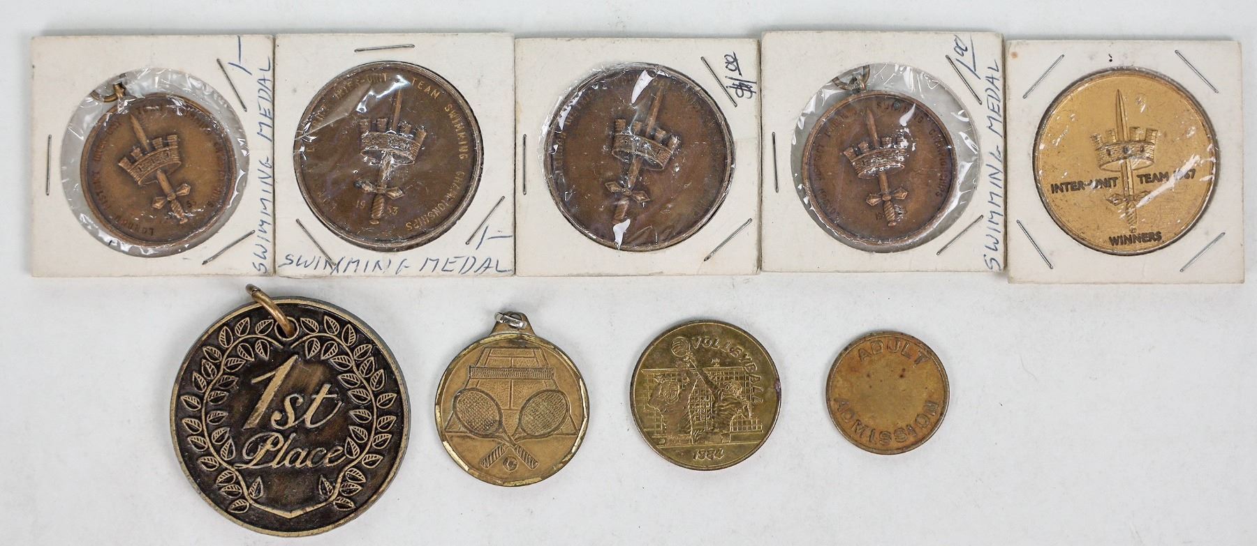 Group of 9 medals from competitions in swimming, volleyball, and tennis. Varying condition; see photos.