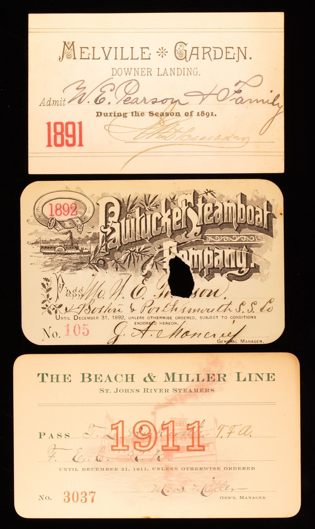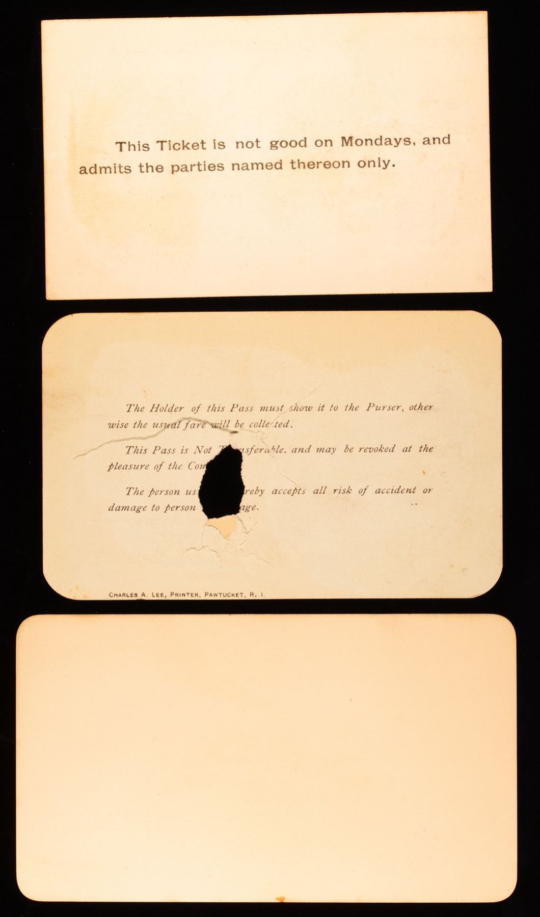 1891 Melville Garden Downer Landing. 1911Yhe Beach and Miller Line with steamer vignette. 1892 Pawtucket Steamboat Company with steamboat vignette, 5/8" hole and tears.