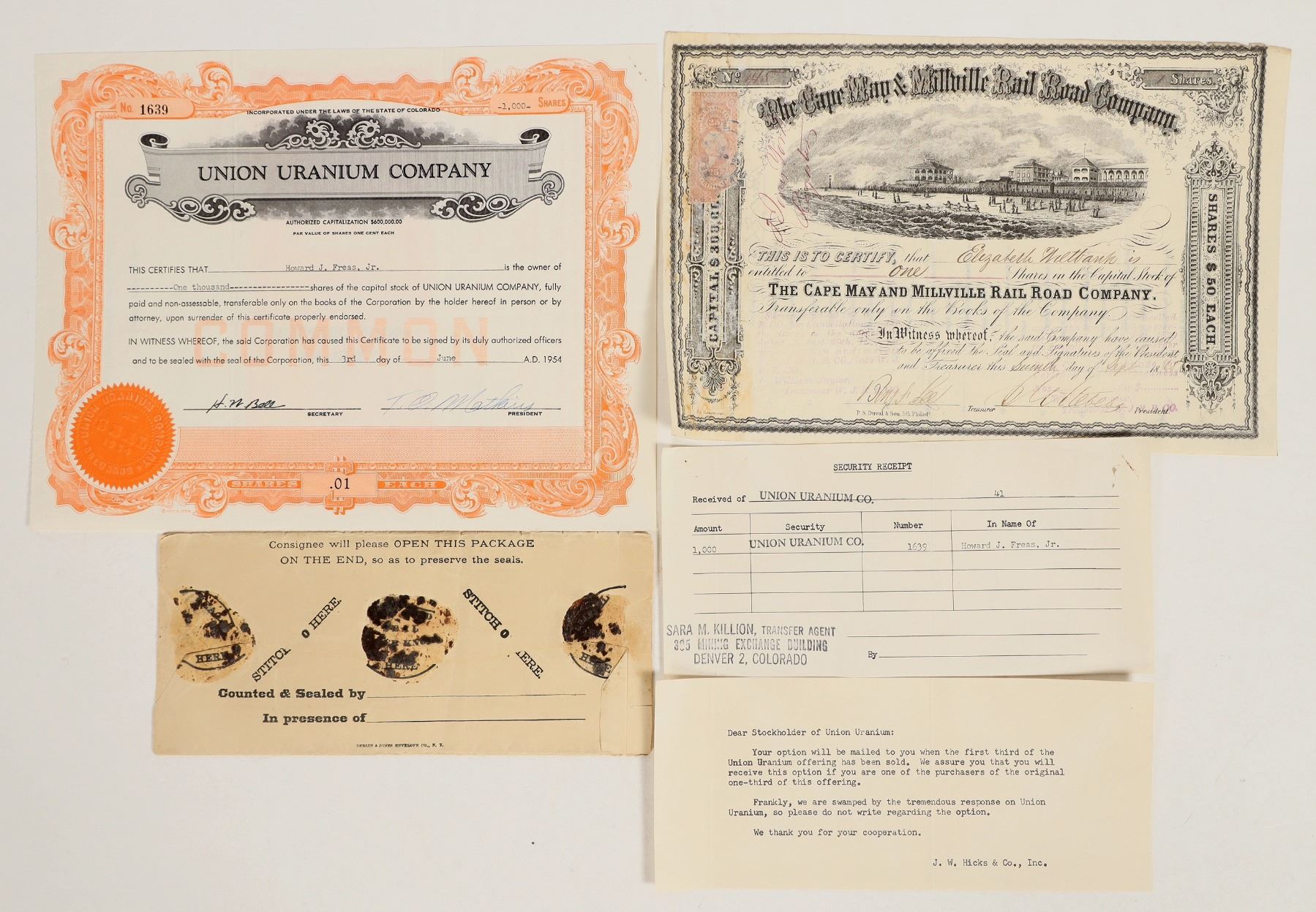 Group of 3 pieces of ephemera. Lot includes 2 stock certificates, one from the Cape May & Millville Railroad Company (issued 1865 w/ embossed company seal + 25c IR stamp, cancelled) and one from the Union Uranium Company (No. 1639, issued 1953, .01 share, embossed seal). Also includes 1886 money remittance envelope from the Southern Express Company. See photo.