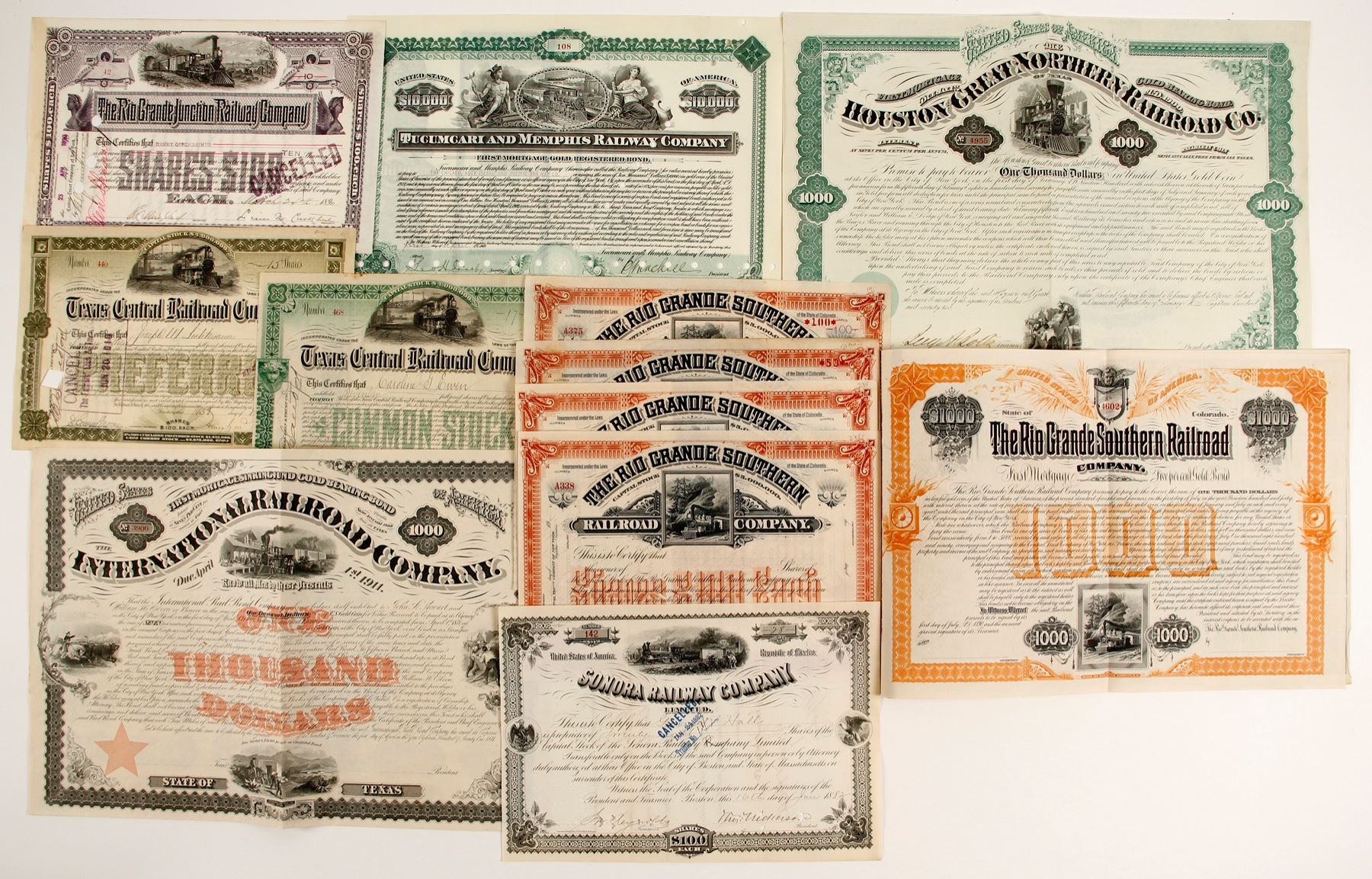 Texas stock certificates (8) 6 cancelled stock certificates, 2 unissued & bonds (4) 2 unissued, 1 cancelled, 1 not cancelled.: All nice train vignettes. 1 Sonora Railway Co, cert #142, 28 shares; Printed: American Bank Note Co. NY & Boston 1 Rio Grande Junction Railway Co. cert.# 42, 10 shares; printed: American Bank Note Co. NY Litho 2 Texas Central Railroad Co cert #440, 15 shares & cert #468 17 shares; Printed: American Bank Note Co. N.Y. 4 Rio Grande Southern Railroad Co, 2 unissued; 100 shares # A375, A182 53 shares. Printed: Homer Lee Bank Note Co. Four bonds 1) $1,000 International Railroad Co. 2) $1,000 Rio Grande Southern Railroad Co. 3) $10,000 Tucumcari and Memphis Railway Col 4) $1,000 Houston Great Northern Railroad Co. By the early 1880s it became obvious that railroads were the key to prosperity for Colorado’s mining camps. Denver & Rio Grande reached Silverton in 1882. Access to a railhead allowed mine operators to ship lower grade ore, and merchant, Otto Mears built a network of toll roads and railroads that transformed southern Colorado earned the nickname “Pathfinder of the San Juans.” Otto Mears, decided to expand from toll roads to railroads. In 1887 he began construction of a line from Silverton over 11,018-foot Sheridan Pass (now called Red Mountain Pass) to the mining camps on Red Mountain naming it Silverton Railroad, known as the Rainbow Route. Railroad completed in 1889 and immediately turned a nice profit. Mears then began construction of biggest endeavor, 162-mile Rio Grande Southern, running from Durango northwest through mining towns of Rico and Telluride, over 10,250' Lizard Head Pass to Ridgway opening in 1891 after 1-1/l2 years of construction with 142 major bridges and trestles. Prag collection.
