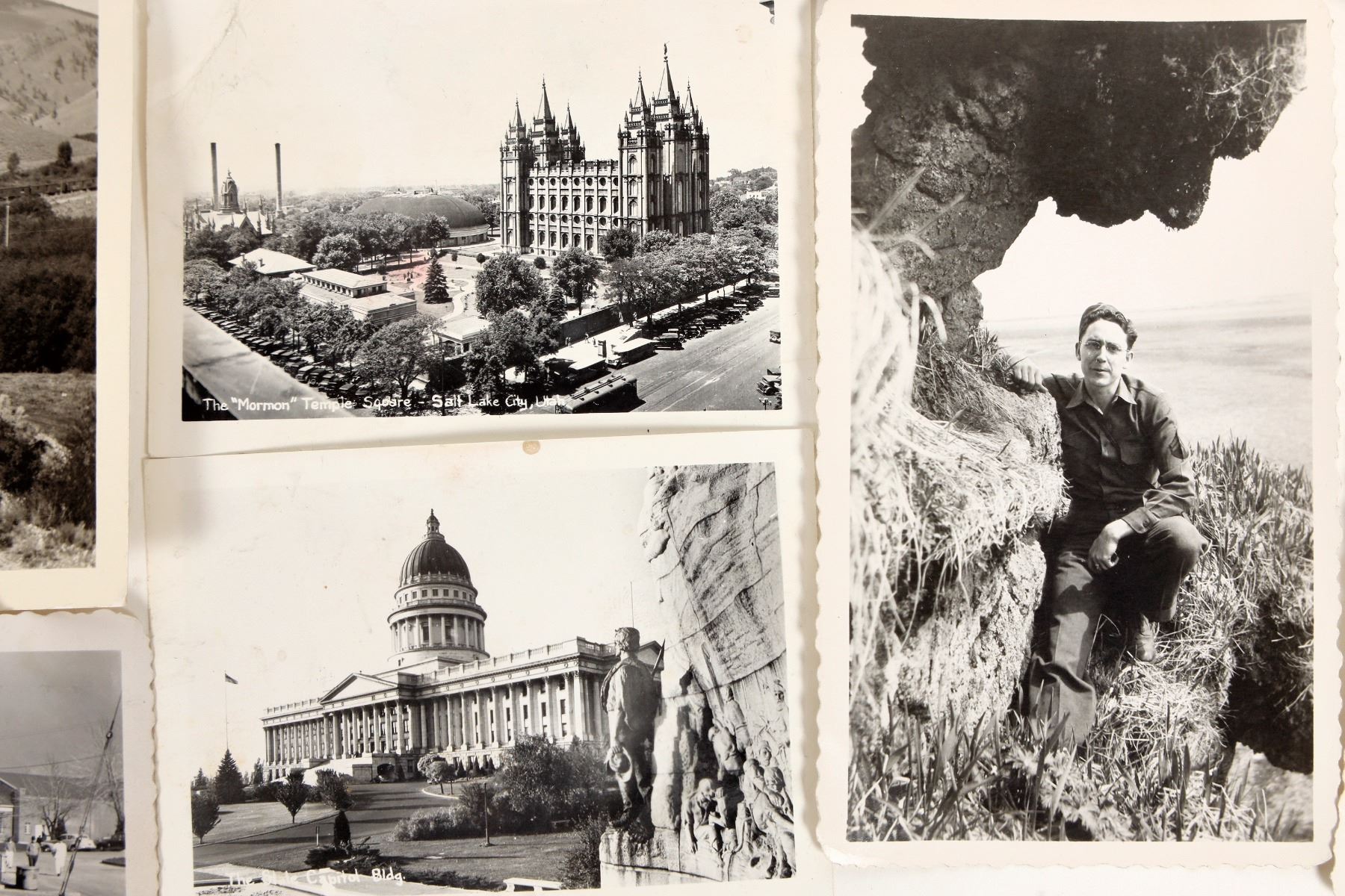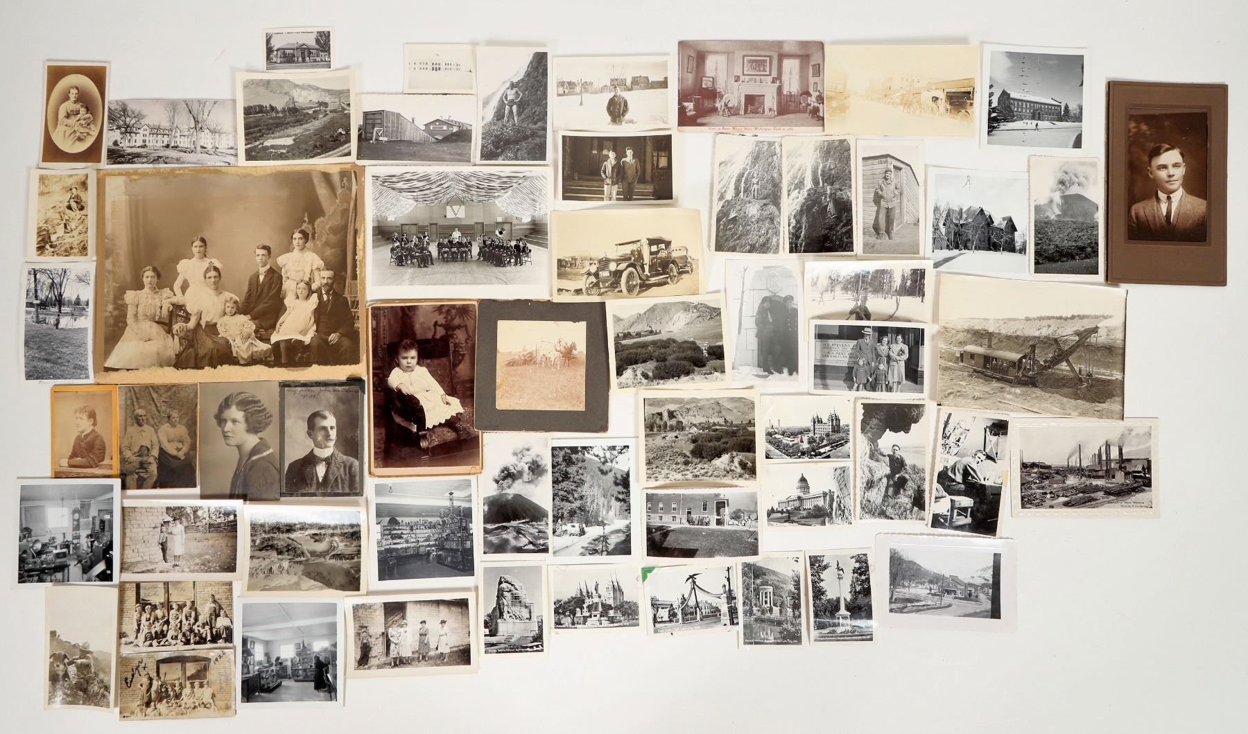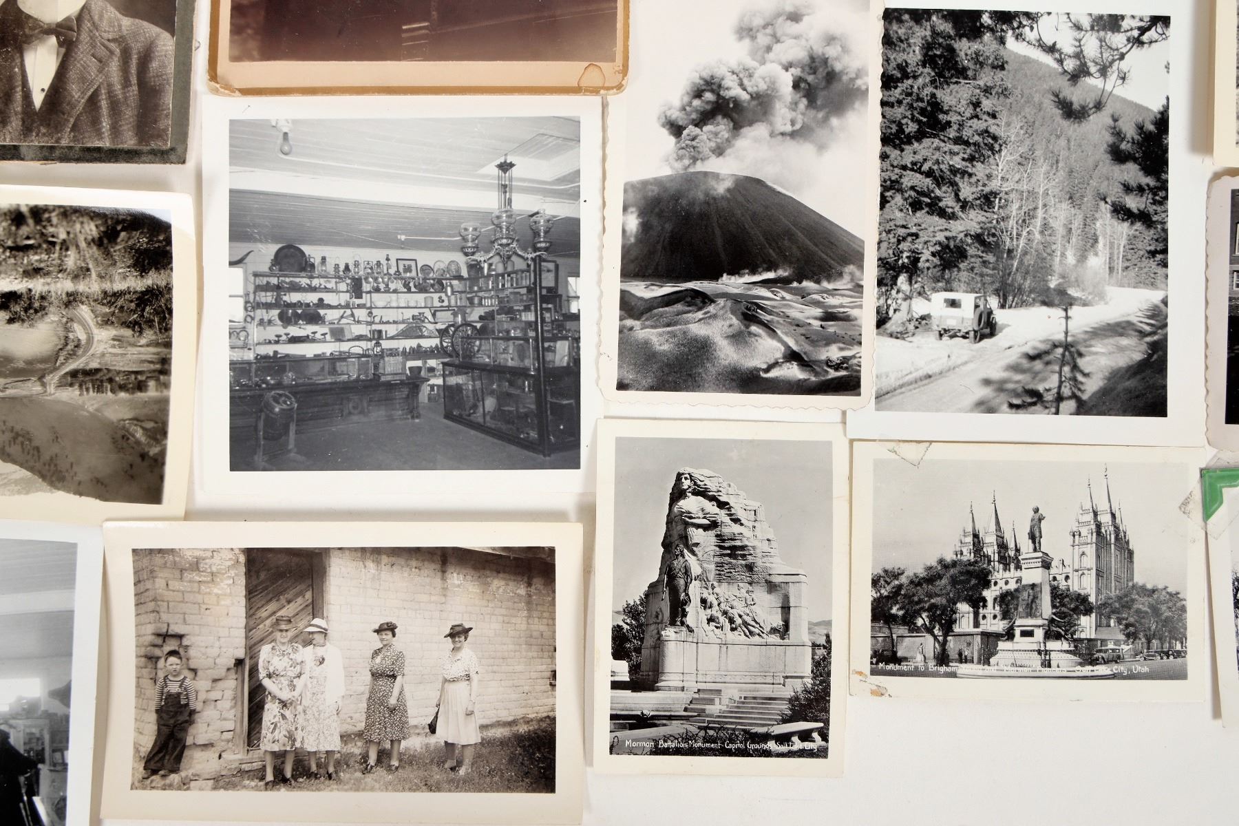 Lot of about 50. Various sizes, from 1.75 x 2.5" to 8 x 10" mounted. Includes snapshots, a cabinet card, a CDV, and more. Various topics including a volcanic eruption, family photos, Western landscapes, and more. Please inspect.