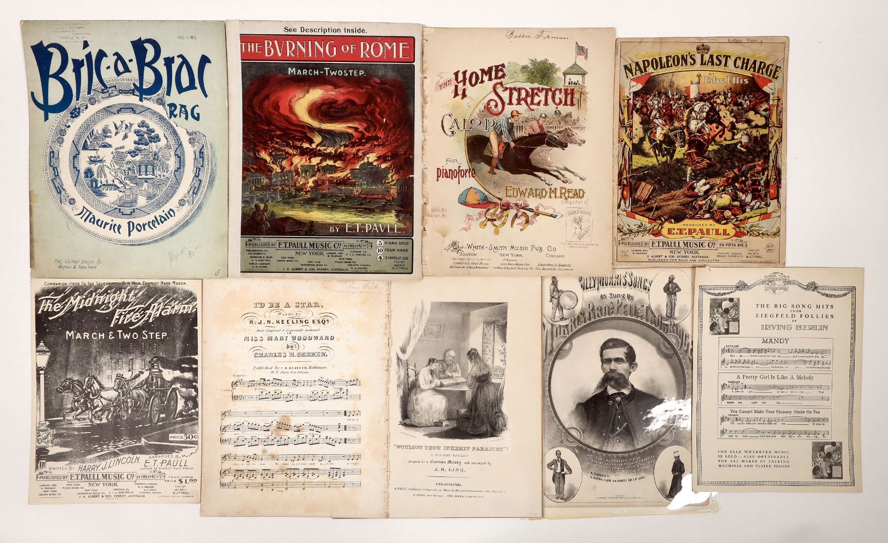 Miscellaneous sheet music, vintage, from 1800s-1915 (9). Includes: rag; fancy covers; inappropriate racial words; etc.