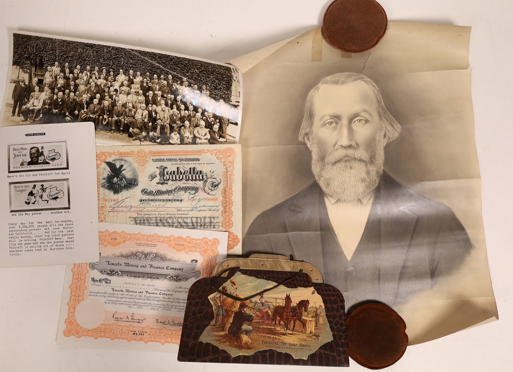 A fun group of different things: Dizzy Dean inviting us to join him drinking Falstaff beer; a drawing of an unidentified gentleman signed Gertrude Hoazen, artist, 1896, 18 x 24, some tears; a group photo of the First Central Washington Mining Congress, Wenatchee, 1927; stock certificate from The Isabella Gold Mining Company and the Lincoln Mining and Finance Company; advertising from Aultman, Miller & Co. maker of Buckeye Mowers, Reapers and Binders.