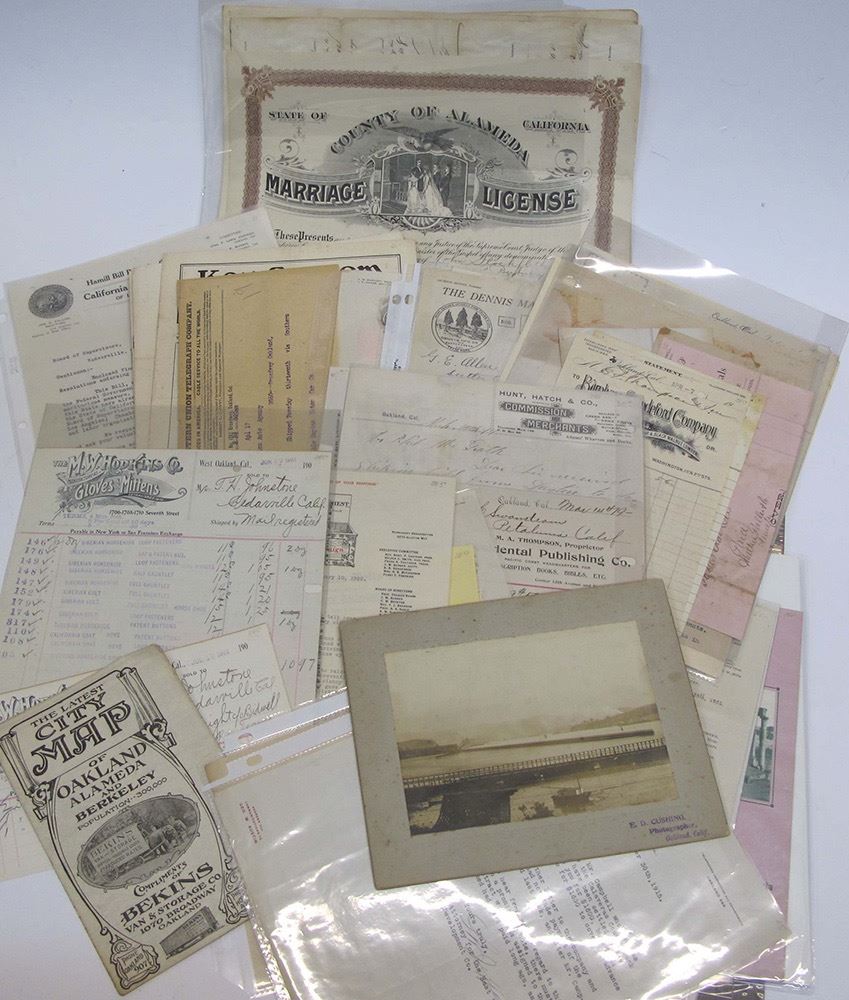Approx. 50 pieces of ephemera ranging from 1) pictures of the full length of the Bay Bridge (exact date unknown but appears to be old) 2.75" x 9.25"; 2) Advertisements from July 1877 in Oakland, Cal of Mueller & Steffanoni, Watchmakers and Jewelers; 3) one photo, with matting of the Bay by Photographer, E.D. Cushing, Oakland, Cal exact date unknown 7" x 9.5"; 4) Marriage Licenses and Certificates ranging from 1868 to 1906 from Bay Area; 5) Letters from the Sloat Monument Association of Cal, 1902, to 1904 to Trinity County Board of Supervisors; 6) One card advertisement for Hotel Oakland opening dinner December 23rd 1912, 8.5" x 6". 7) "The Latest Cit Map of Oakland, Alameda and Berkeley, population 300,000, dated 1907. Circulated by Bekins Van and Storage. 14" x 14"; 8) One picture with several insets of "Artistic Homes of California" featuring Residence of Judge J.A. Waymire, Corner of Walnut Str., and Buena Vista Ave., Alameda, CA. dated 1890, 9.5" x 12", so much more! Date: c. 1800's - mid 1900's Location: Oakland/Berkeley, North Bay, California HWAC # 54272
