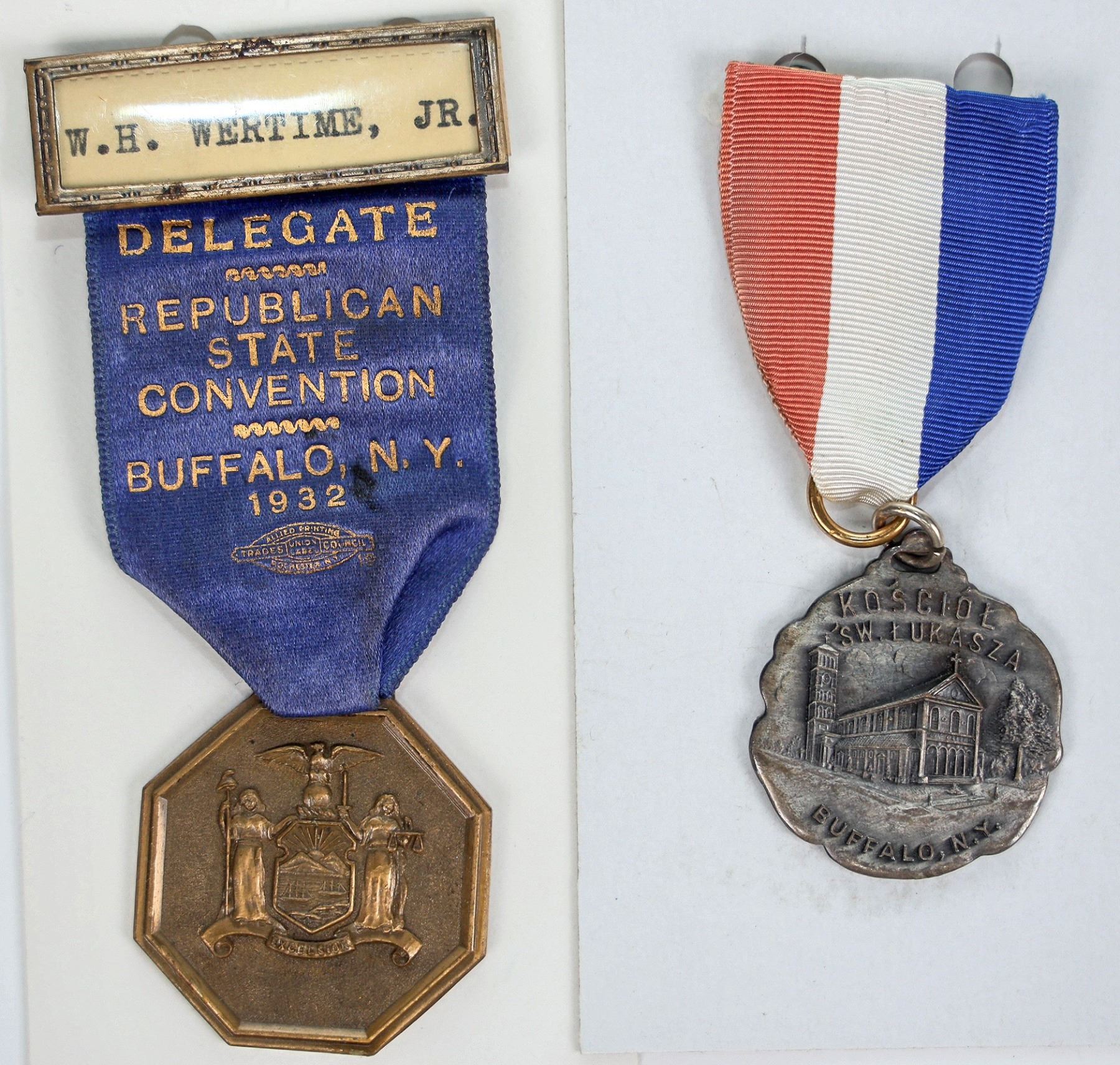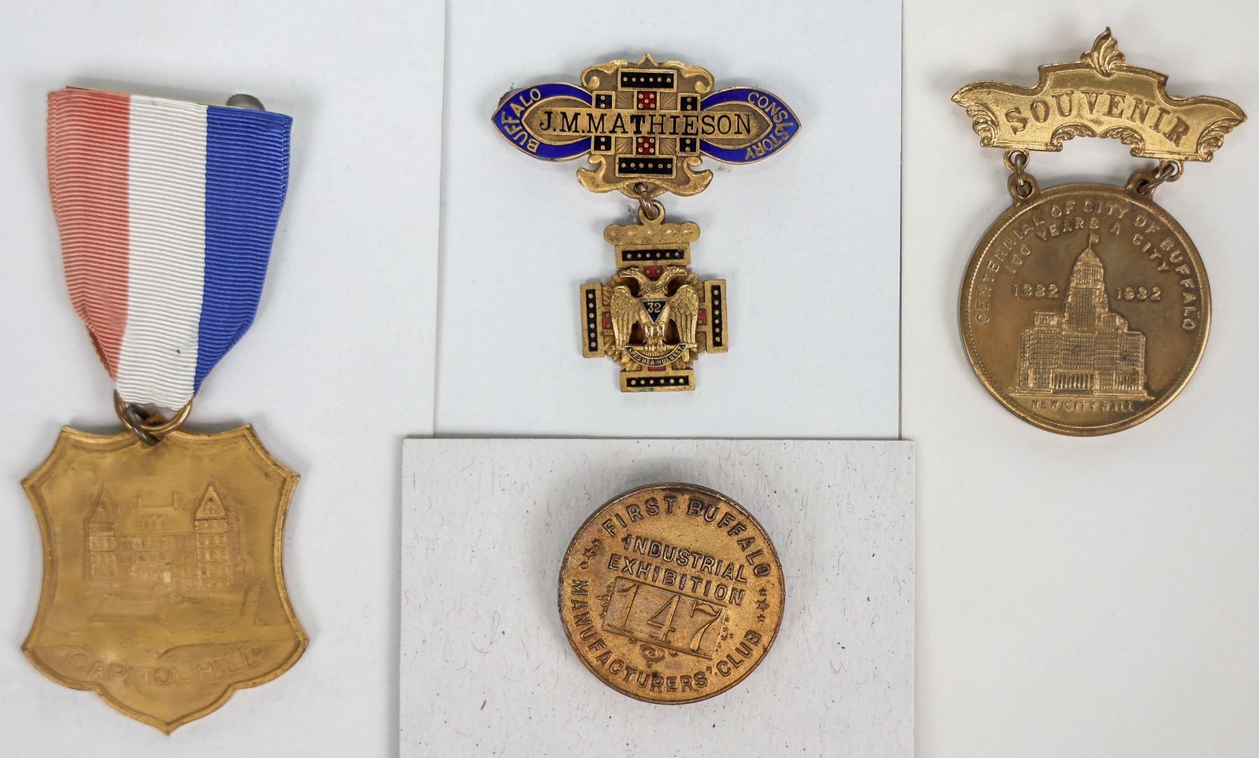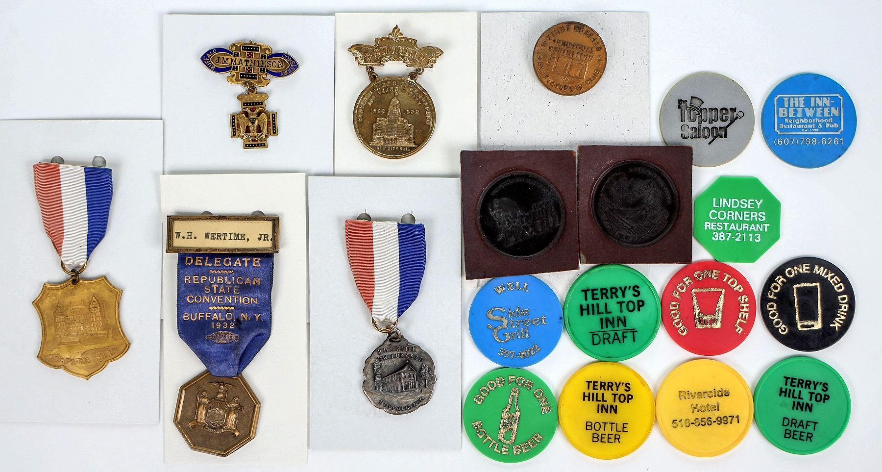 Lot of 20. Includes: 1928 Catholic Church; First Buffalo Industrial Exhibition Manufacturer's Club pin-back; 1932 souvenir pin-back one side George Washington bi-centennial, the other side Buffalo centennial; 1932 Republican State Convention; badge for Buffalo Consistory, undated; Capitol Hill pin-back 1962; same pendant 1953; Talking Proud die trials on rubber, front and back; and 11 plastic New York bar type tokens.