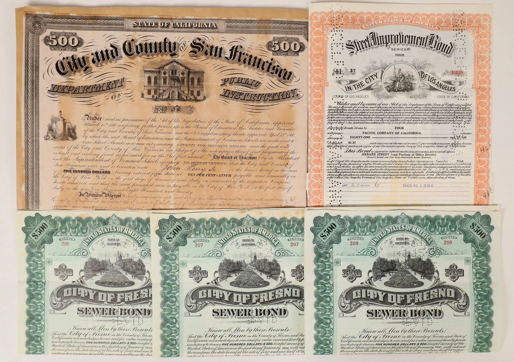 Lot of 5. 1) Best is a City & County of San Francisco, Department of Public Instruction, $500 bond issued in 1860. Signed by William Pearson, President of the Board of Education, and James Denman, supt. of Common Schools. Britton & Co. Mounted with paper backing. Heavy discoloration. 19.5 x 15" 2) Los Angeles Street Improvement Bond, 1931. 3) Three City of Fresno Sewer bonds, 1906, all signed by the mayor.