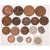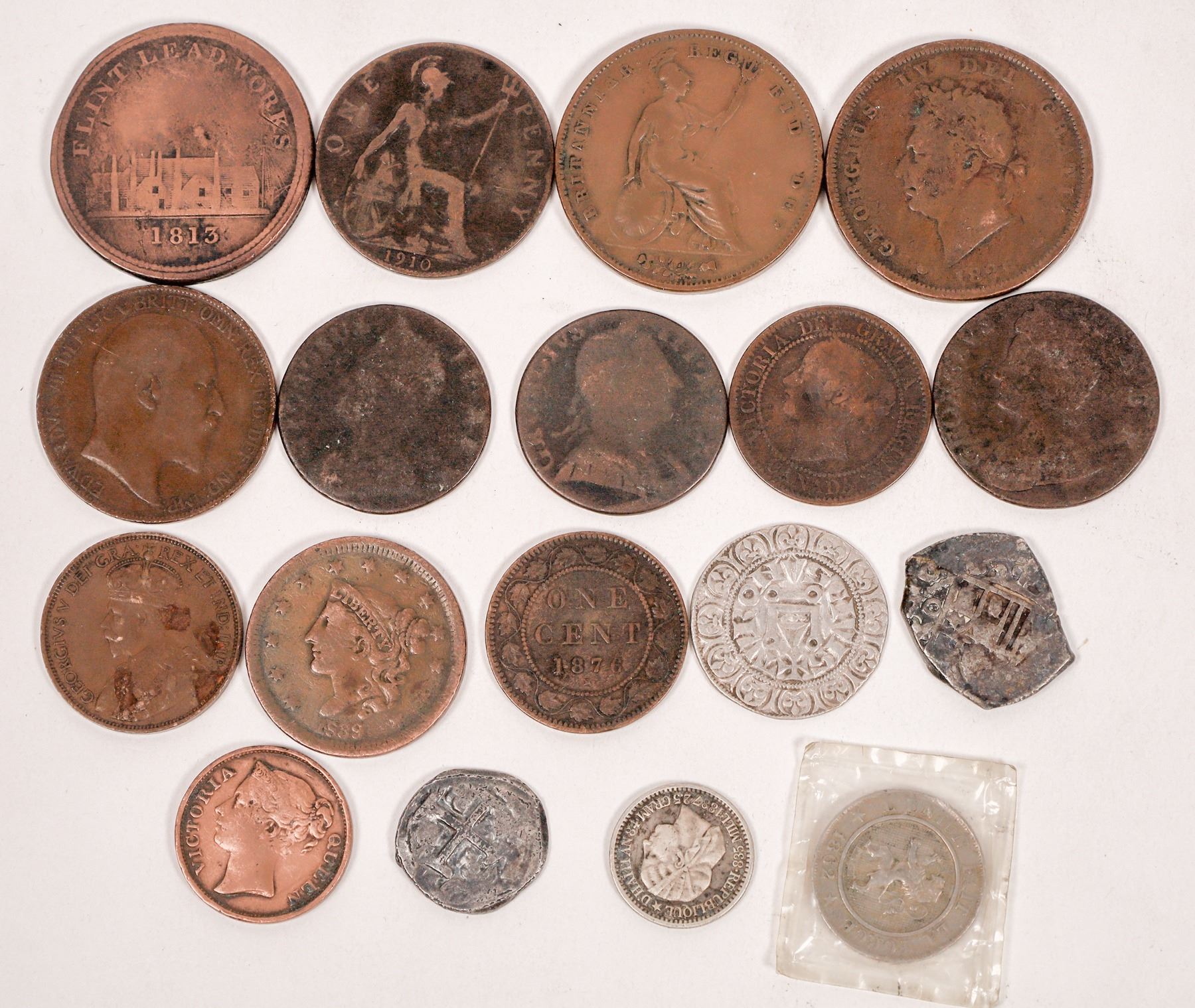 Lot of 18 well worn coins. 1839 U.S. large cent; 1845 East India Company half cent; 1826, 1845 English pennies; 1876 Canadian penny; 1859 Canadian penny; three ancients; 1813 Flint Lead works one penny token; 1887 republic of Haiti ten cent; 1917 Canada one cent; and several unreadable coppers.