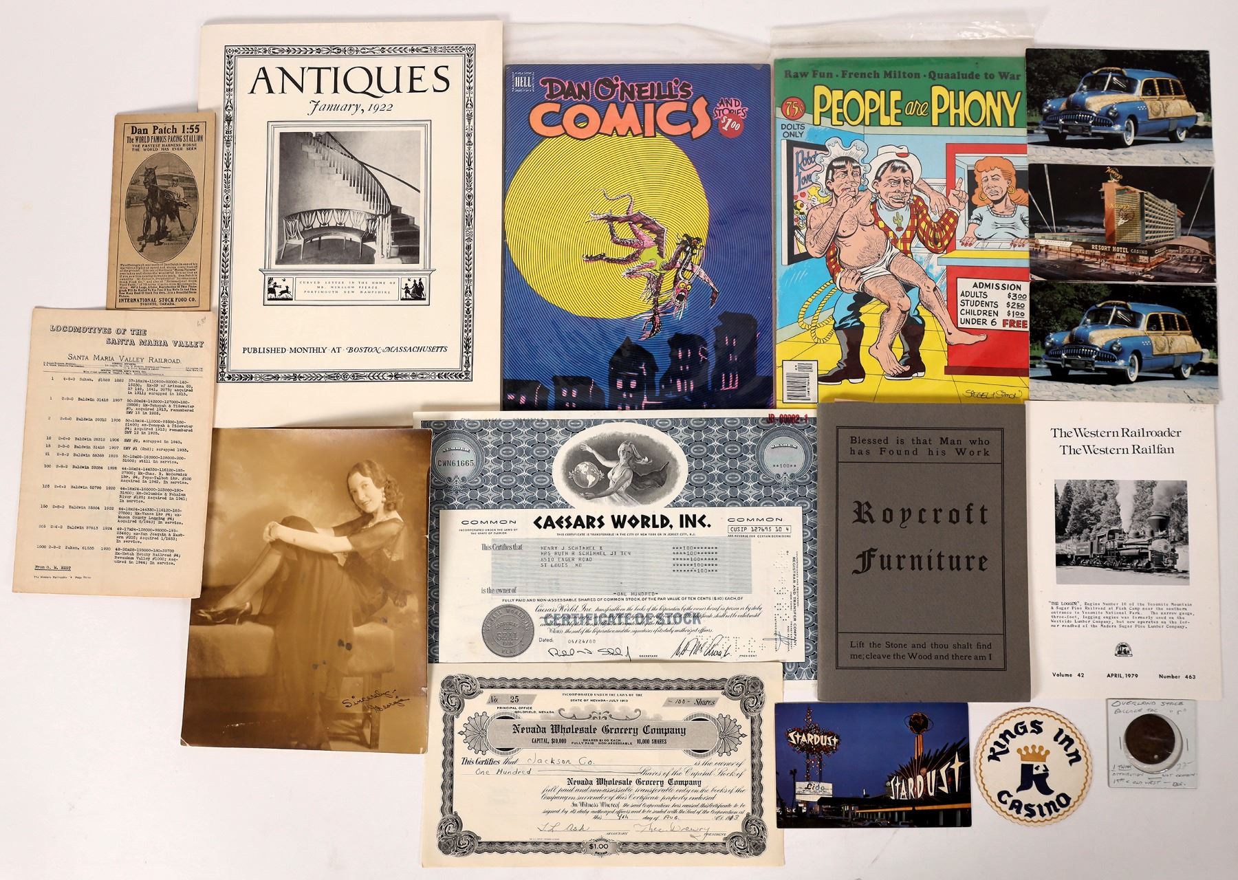 Lot of 17. One item is not ephemera : brass round tag w/ the word "Overland" stamped on it, small hole . It looks like it's a baggage tag. Could not verify if it was Overland Stage, it didn't look lile the ones I could locate and doesn't say stage on it. Included : One Caesar's World Stock cert. dated 1980. One Nevada Wholesale Grocery Stock Dated 1913. Three Casino post cards. Kings Inn coaster. 1922 Antiques Magazine, two comic books, photo of woman, two sales books and two Western Railroader handouts. Ken Prag Collection