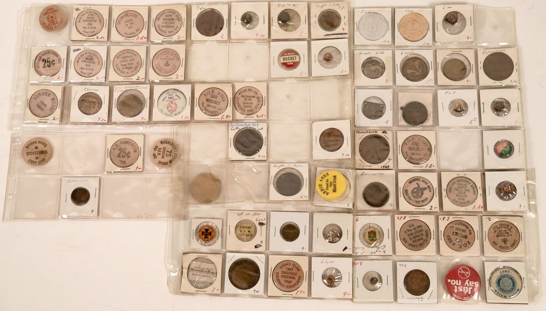 Lot of 65 miscellaneous fraternal tokens, medals and pinbacks from the U.S. Includes: American Legion, Lions Club, V.F.W., Valley of Fort Scott, Shriners, Rosicrucian, Moose Lodge, Osman Temple, Knights of the Golden Eagle, Knights of Pythias, Scottish Rite, DeMolay Rocket Club, F.O.E., K.O.T.H., Kiwanis, National Federation of Women's Clubs, Jaycees and more. Collection includes brass, aluminum, copper and plastic medals and tokens, wooden nickels, club pins, and pinback buttons, mostly from the 1960s and 1970s. SEE ADDITIONAL PINBACKS AND RIBBONS UNDER THE GENERAL AMERICANA SECTION!