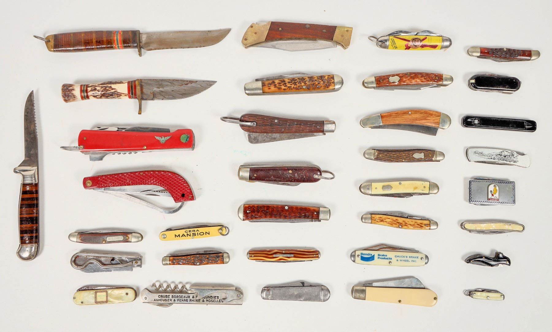 This lot contains over 30 used knives. There are several unique folders here. One Schrade hawkbill Scrade + 176 USA, a sharpening rod with sheath, and a Schrade wire back in used condition. There is something here for everyone. Please see photos for details.