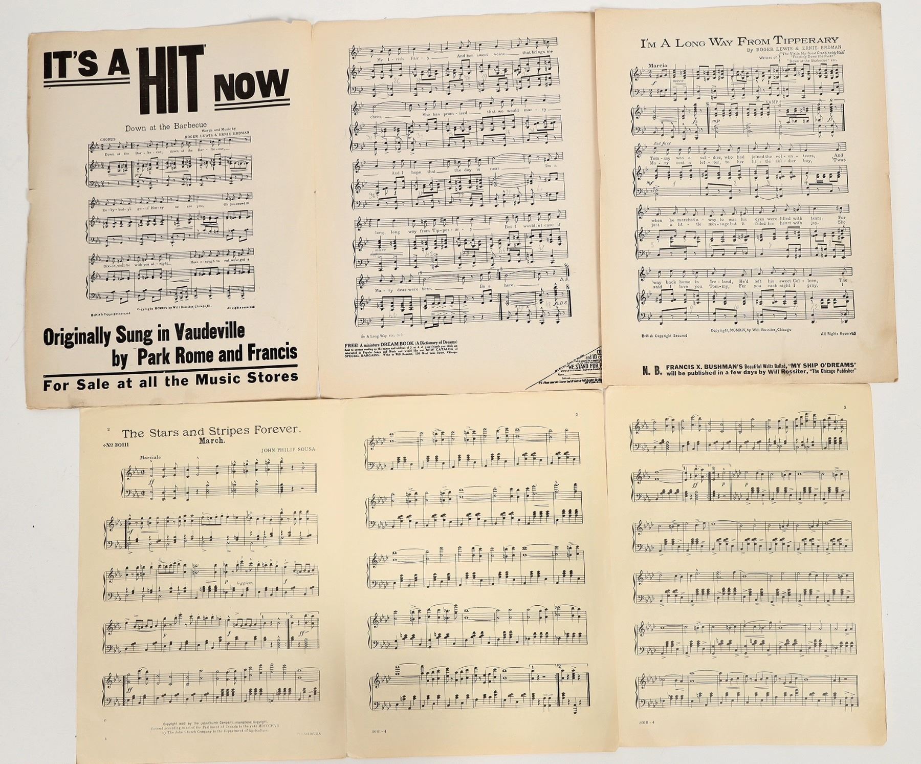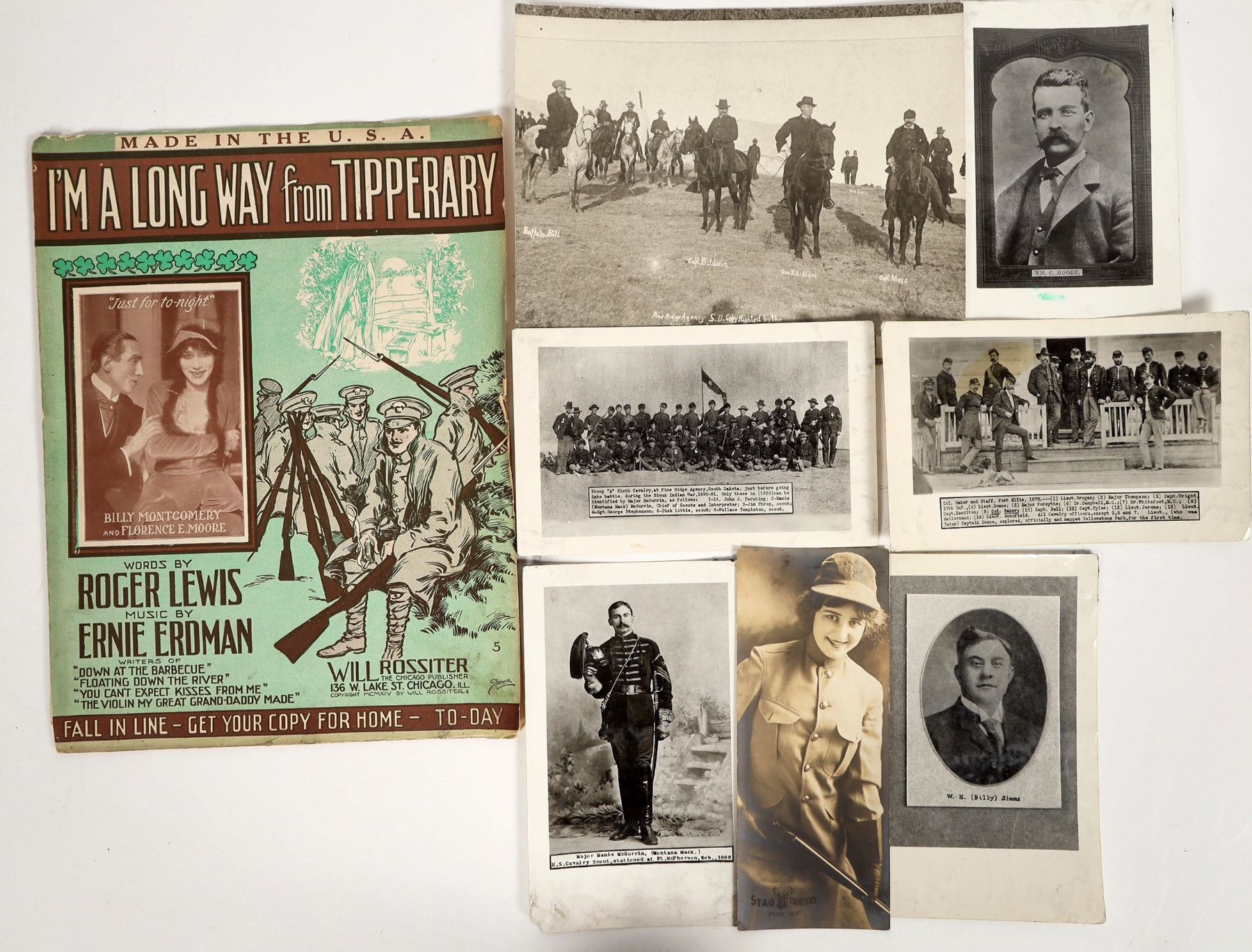 Lot of 9. Includes: The Stars and Stripes Forever, Sousa (sheet music); I'm a Long Way from Tipperary (sheet music); five photo prints from the Rose Collection; Stag Trousers advertisement; and photo reprint that includes Buffalo Bill at left.