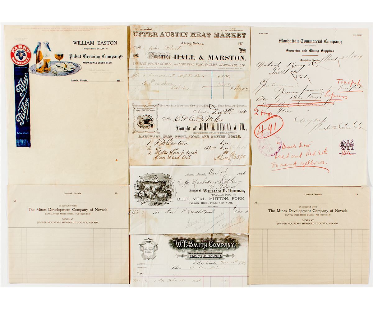 Lot of 8. From Austin: Hall & Marston, Upper Austin Meat Market, c.1870s, soiling and tears; Color illustrated billhead for William Easton, Wholesale Dealer in Pabst Brewing Co., vignette of blue ribbon and beer bottles, c. 191-, toning; John M. Duncan & Co., Hardware, vignette of tools, 1865, folds and soiling; William D. Deeble, Wholesale Dealer in Beef, Veal, Mutton, Pork, cattle vignette, 1886, soiling. From Manhattan: Manhattan Commercial Mining Co., Groceries and Mining Supplies, 1919, folds and toning. From Elko: W.T. Smith Company, Gen. Merch., 1889, soiling and rips. And finally from Lovelock: two unused billheads for the Mines Development Company of Nevada, c. 19--.